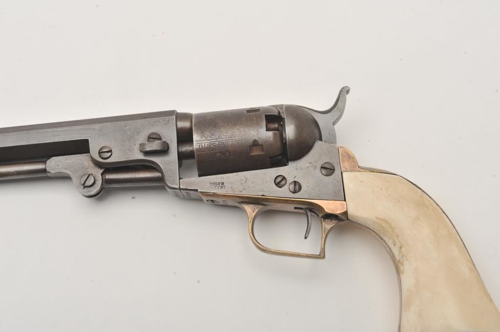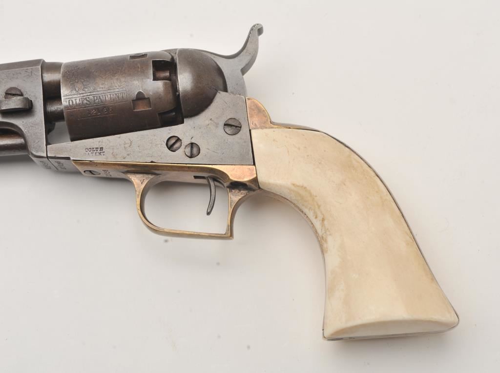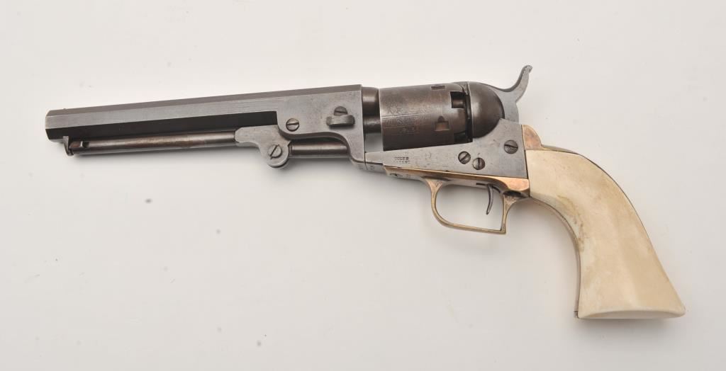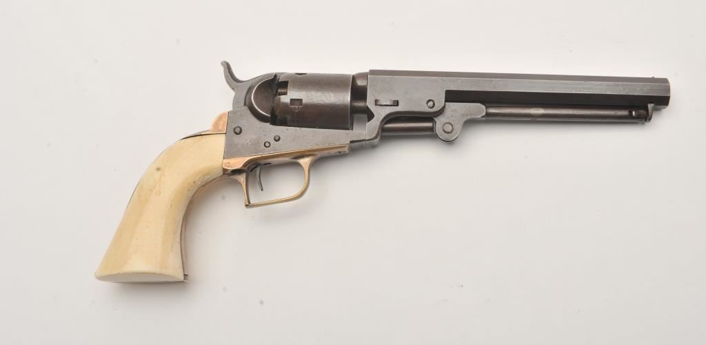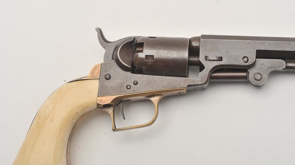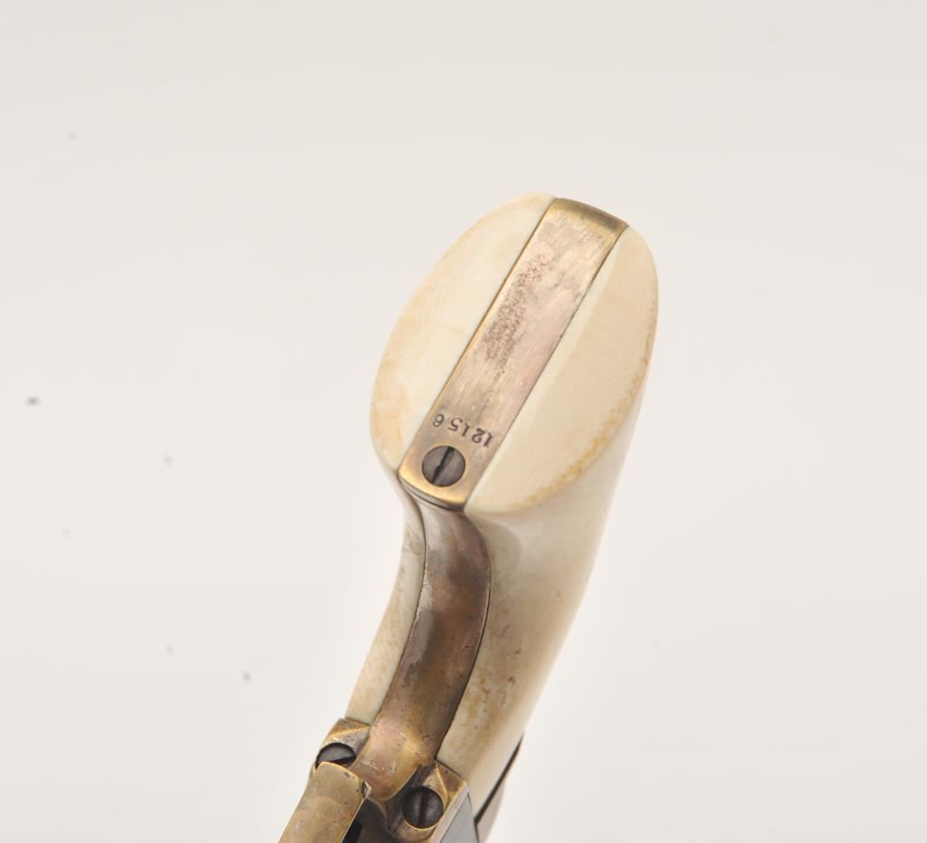 Colt transition baby dragoon to pocket model with 6” barrel and ivory grips, S/N 12156. Inscribed “F. Frye” in script (Very light). Old re-browned finish and replaced grips showing overall restoration that is well done. (Antique) Est.: $1400-$2800