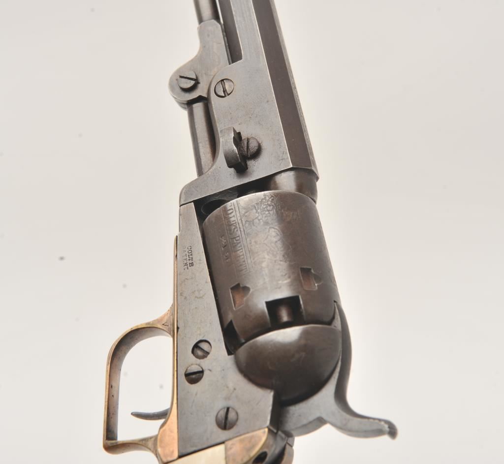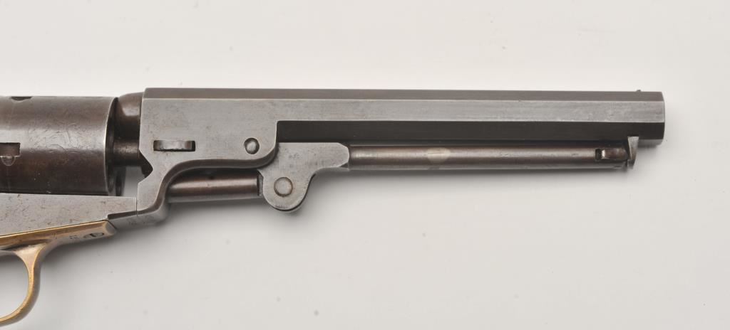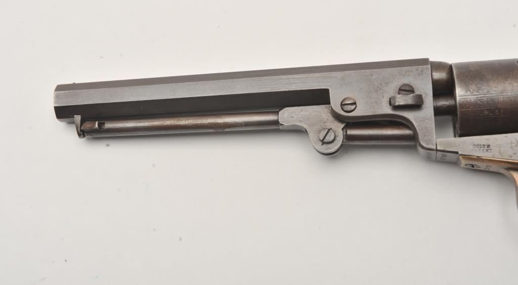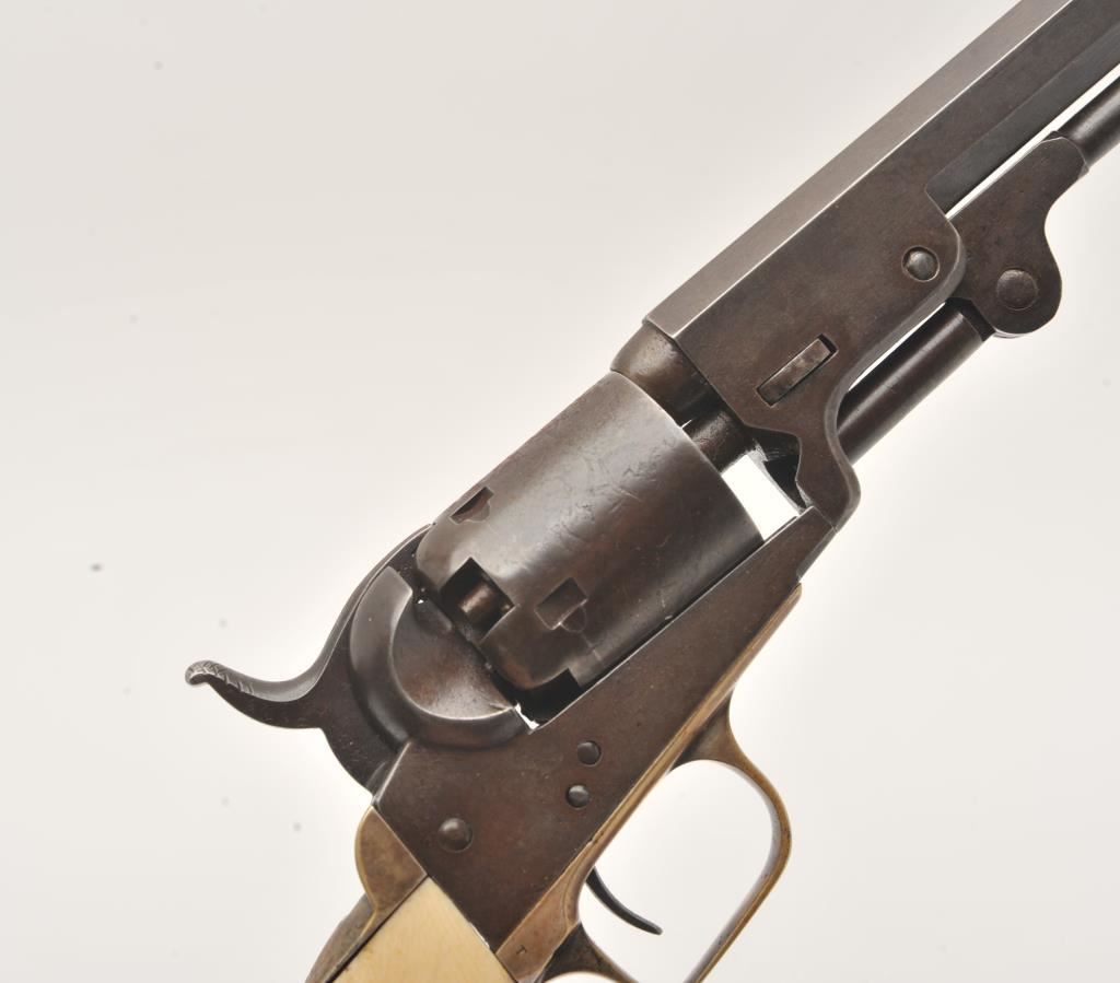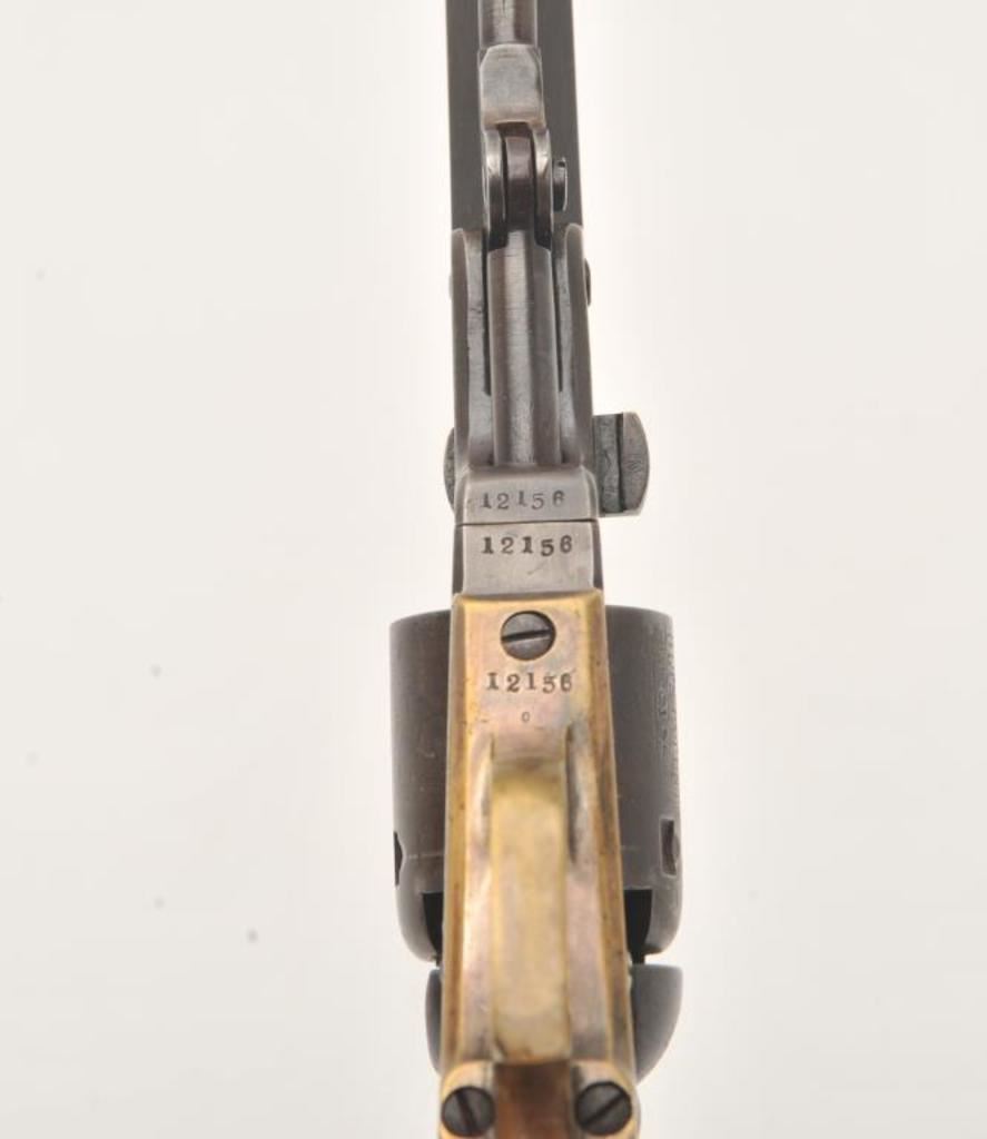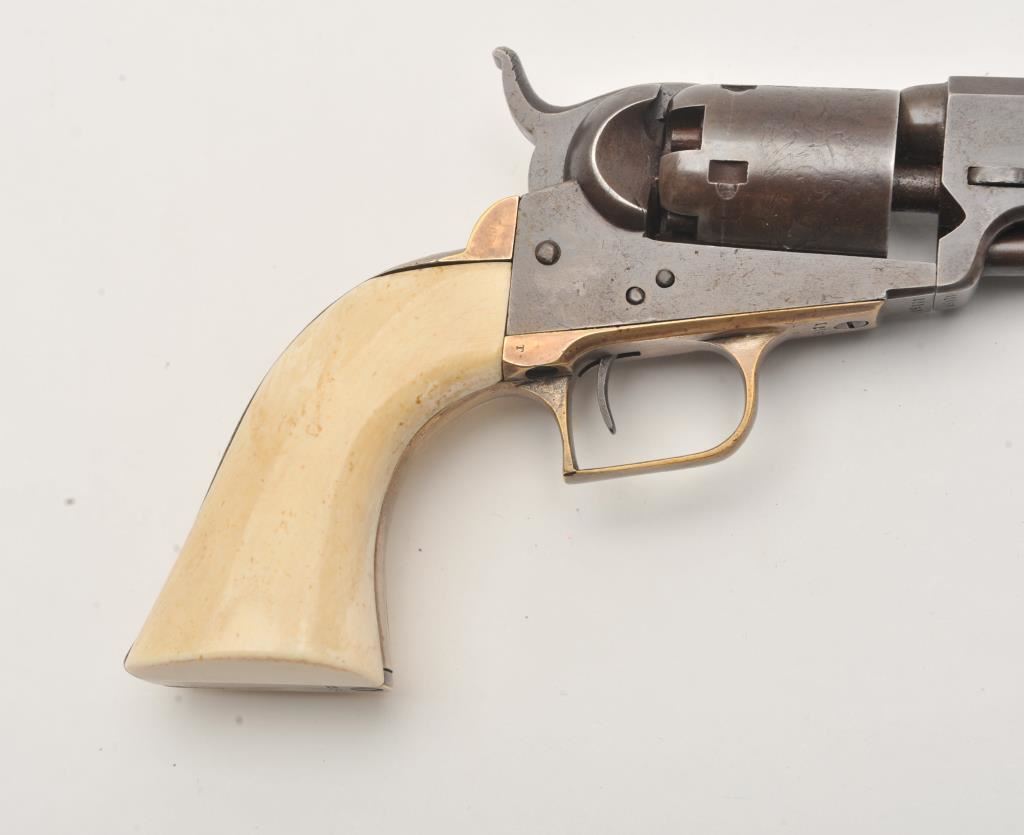 Colt transition baby dragoon to pocket model with 6” barrel and ivory grips, S/N 12156. Inscribed “F. Frye” in script (Very light). Old re-browned finish and replaced grips showing overall restoration that is well done. (Antique) Est.: $1400-$2800