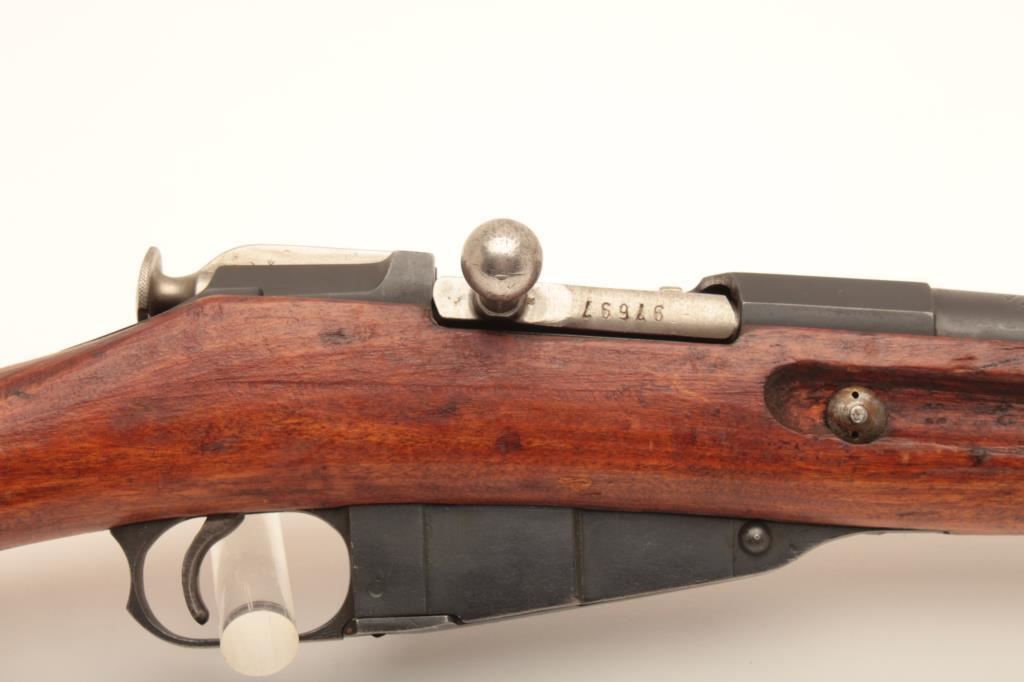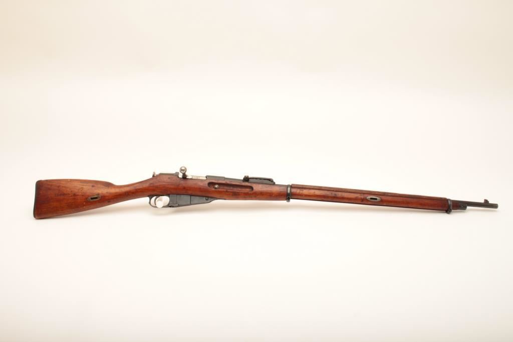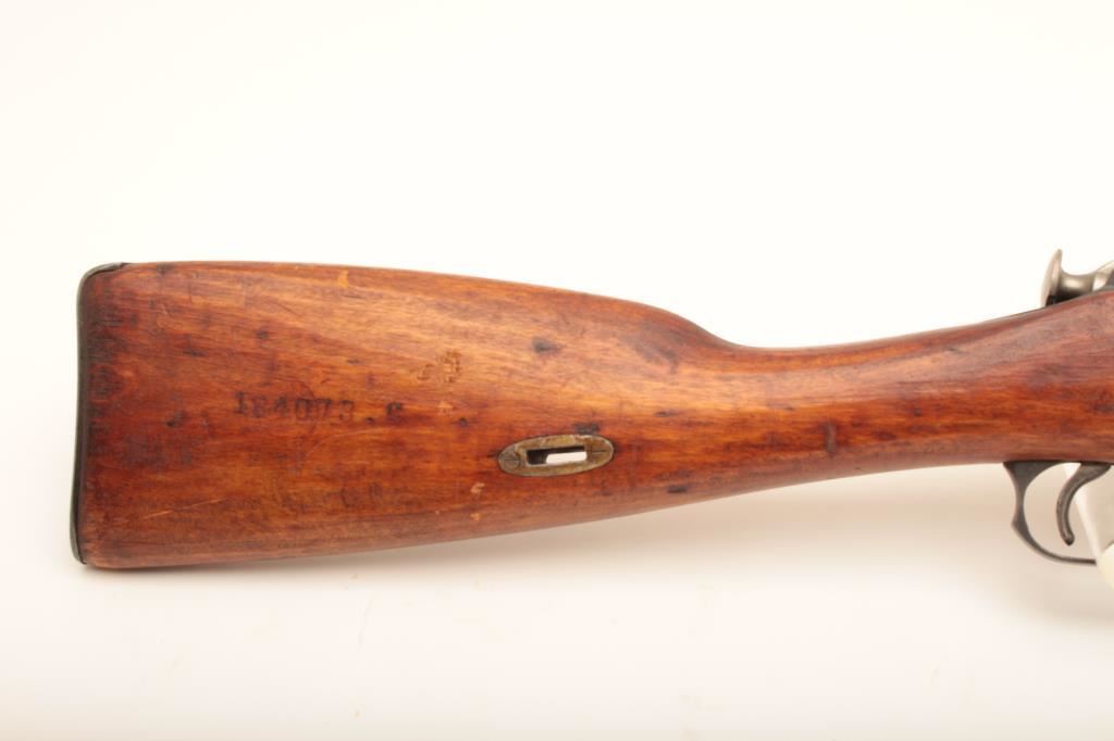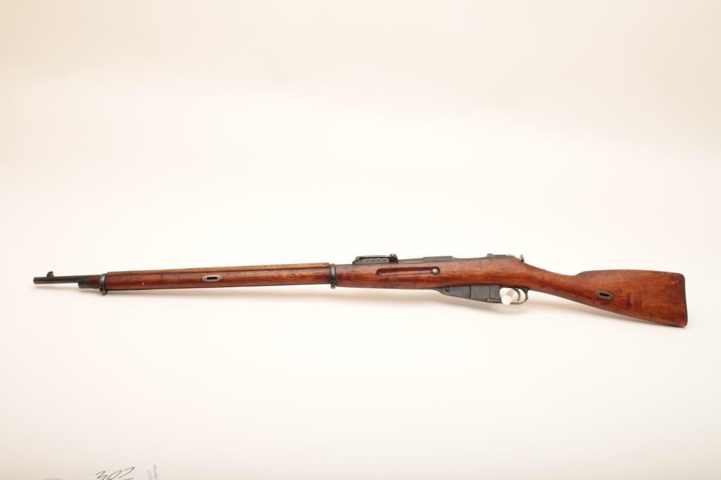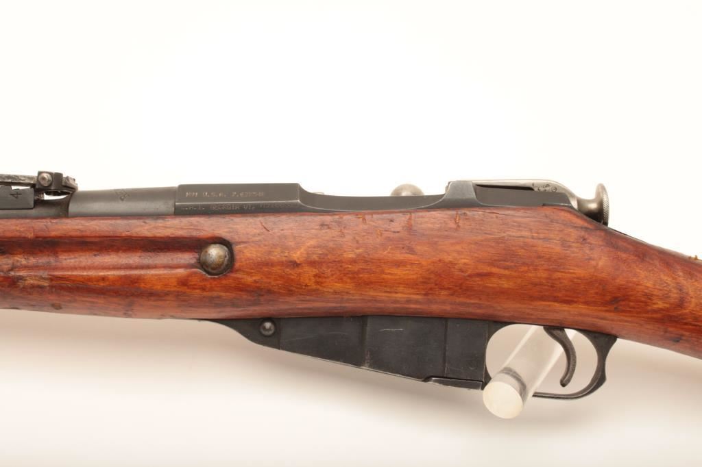 Remington Armory 1917-dated Mosin Nagant bolt action rifle, import-marked, 7.62 x 54R caliber, 32” barrel, missing cleaning rod, wood stock, S/N M9100523; overall good condition with majority of military finish remaining on metal surfaces, good bore, crisp action, good markings and good wood stock showing scattered mars and scratches from carry and storage. (C&R). Est.: $200-$400.