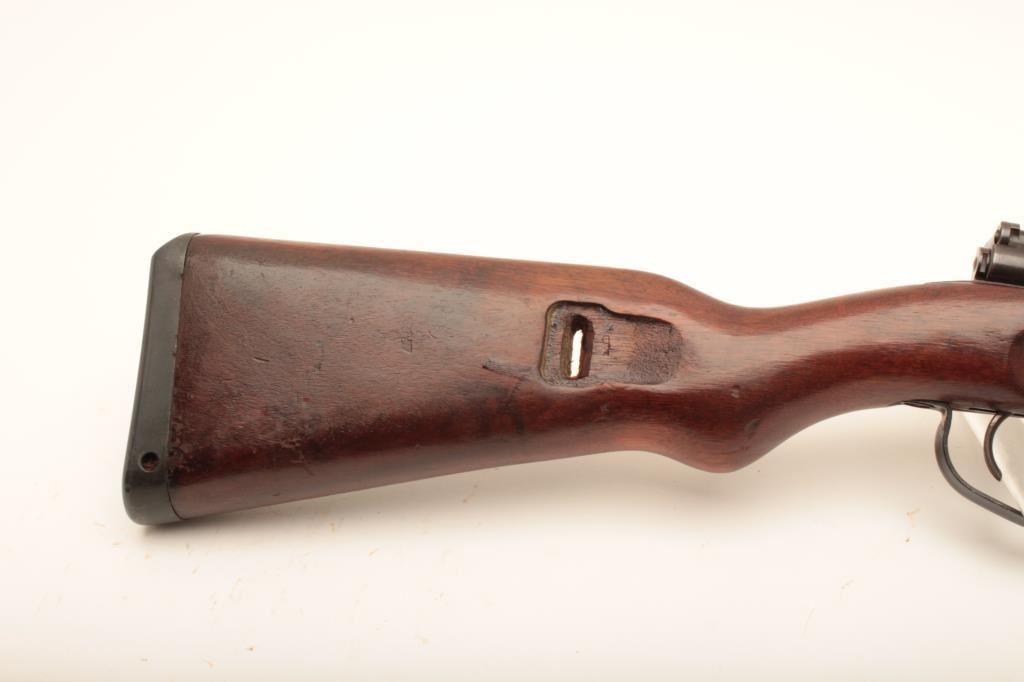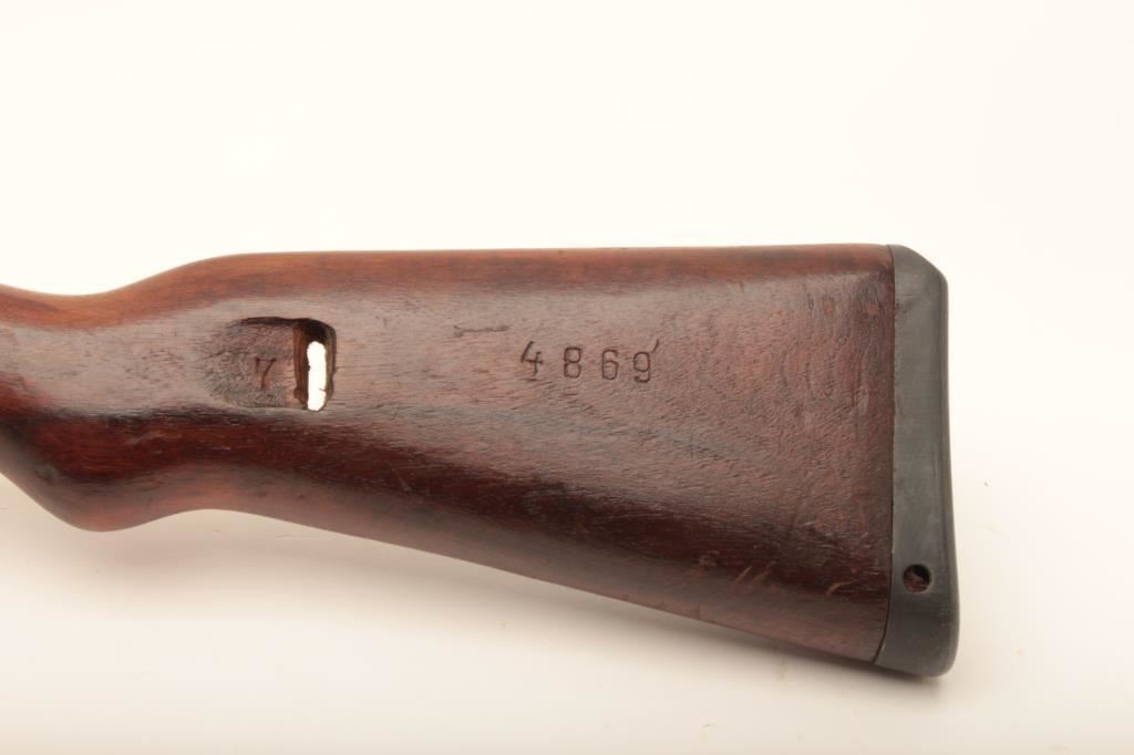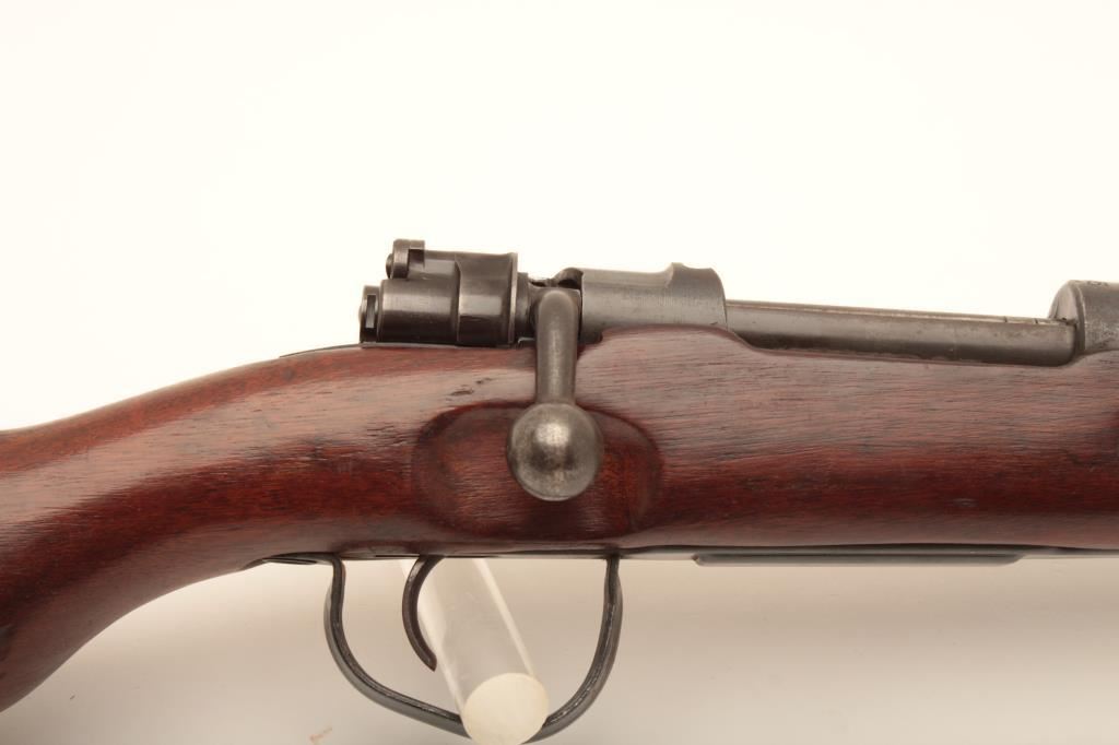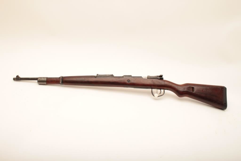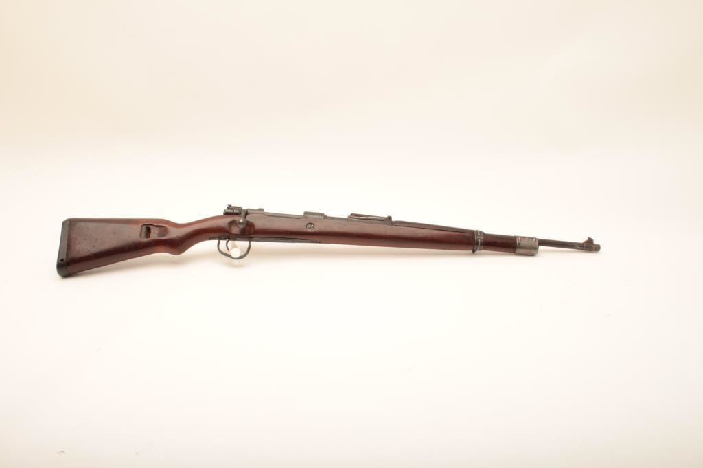 German Mauser Model 98 (dou.45) bolt action rifle; accompanied by a tag indicating Lot 5537 Ellis Props Auction – Day 5 (no further information); consignor’s notes indicate “Movie Gun” and “30-06 blank” but unlike two other “movie guns” (Lots 304 and 328), there is no stamped indication of the conversion on the barrel as in the case of the other lots, therefore buyer should have a competent gunsmith determine the caliber of this rifle, firing condition, etc.; 24” barrel, military blued finish, wood stock, S/N 9634J; overall good condition with majority of muted blued finish remaining, good bore, crisp action and markings, good to very good wood stock (See Lots 304 & 328 for other Ellis Props “Movie Guns”). (C&R). Est.: $200-$400.