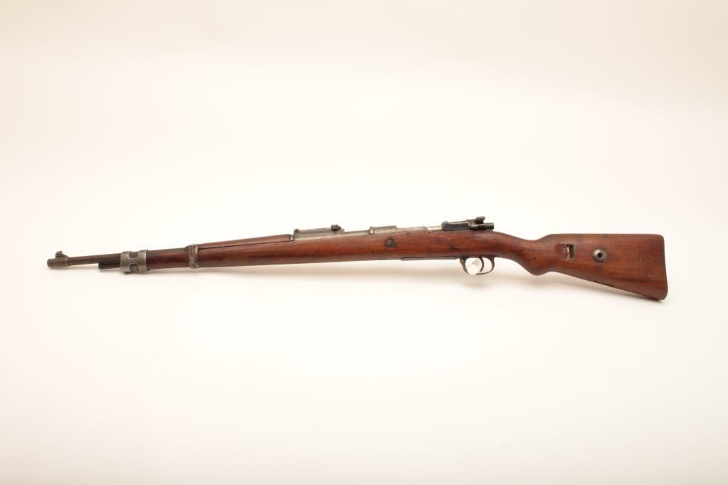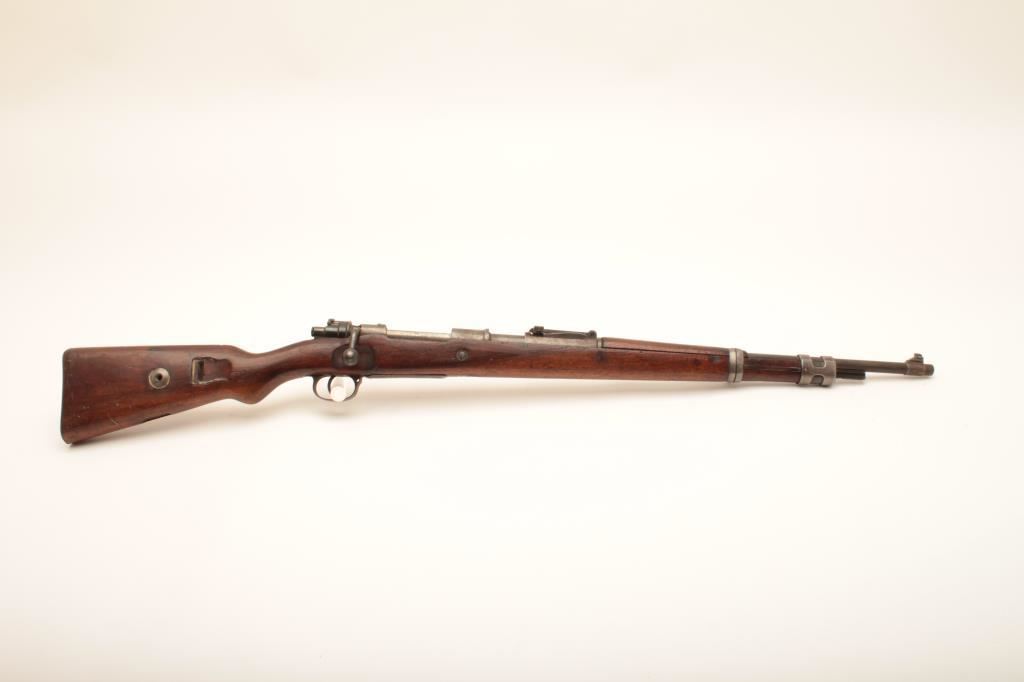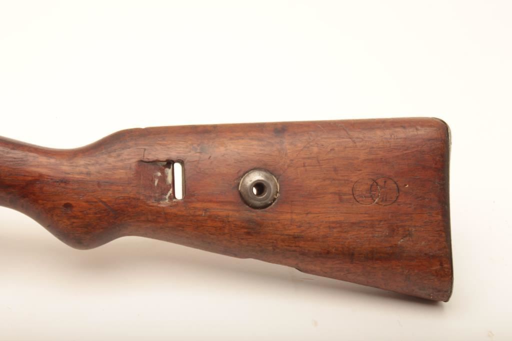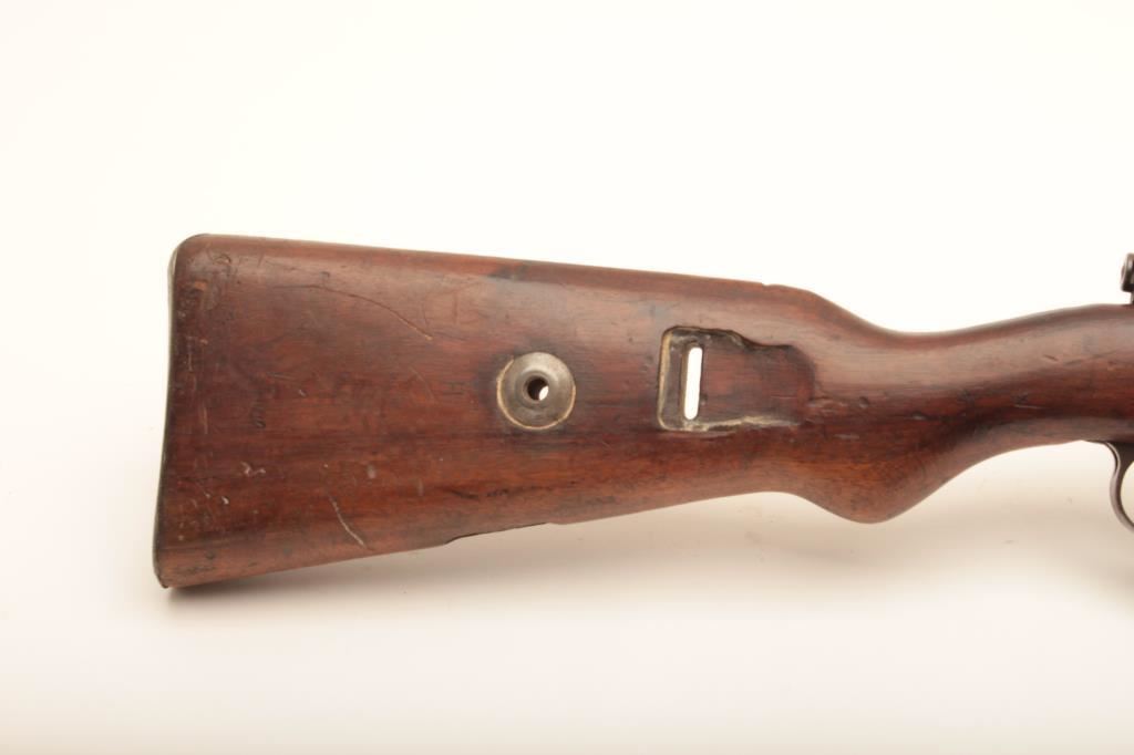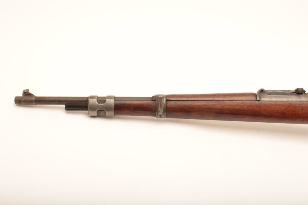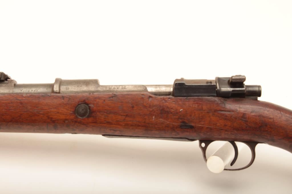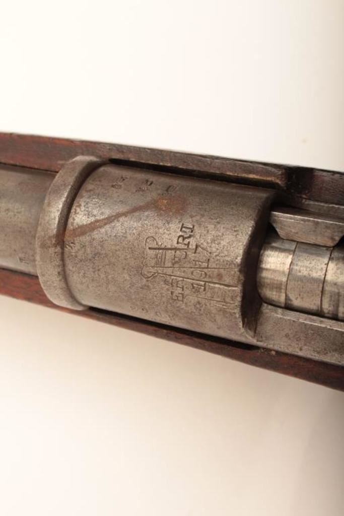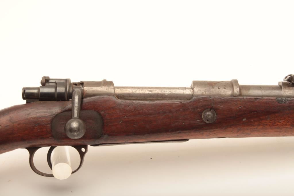 German Erfurt Mauser bolt action rifle dated 1917, top of barrel stamped 30 06 E (similar to stamping on Lot 304 with consignor note as “Movie Gun” but no corresponding tag; may be another from Ellis Props Auction) 24” barrel, military finish, wood stock, S/N 8206; overall good condition, un-cleaned, showing grey patina to metal surfaces, fair to good bore, good action and good stock with scattered mars and scratches from carry and storage. (C&R). Est.: $200-$400.
