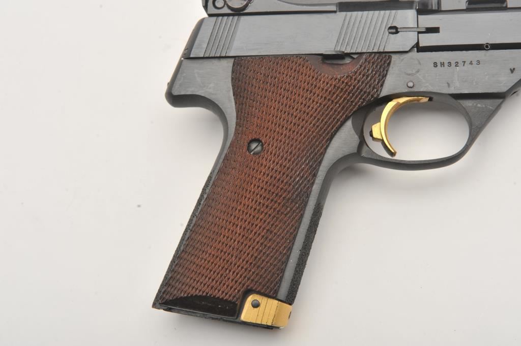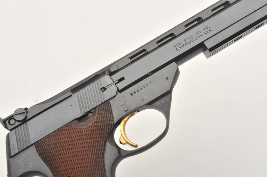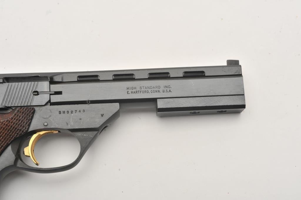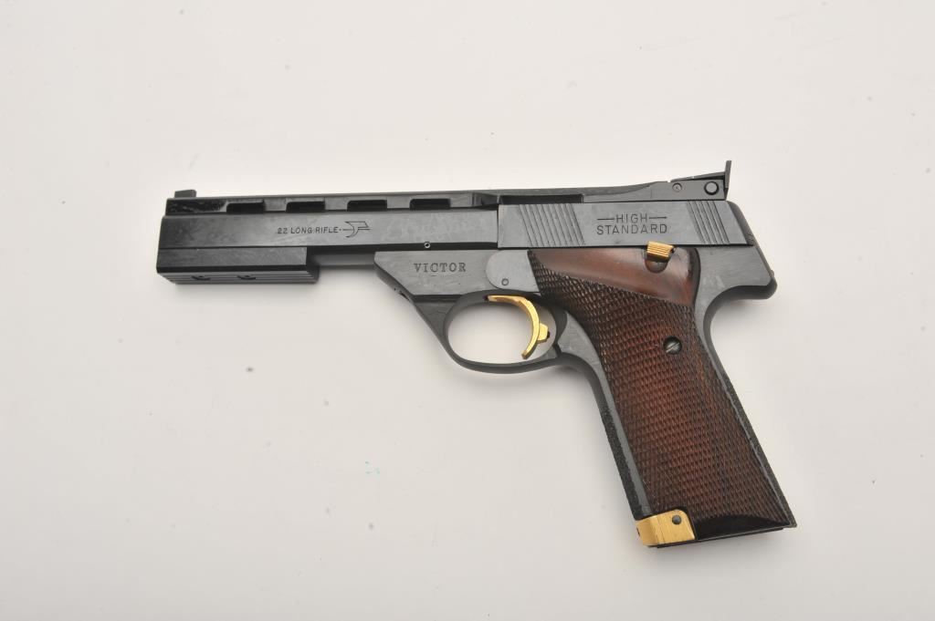 High Standard Victor, #SH32743, .22 LR cal., 5.5" vent rib barrel, blued finish, adjustable sights, with checkered wood grips. Pistol is in excellent condition overall, showing 99% original finish. The grips are excellent with no chips or cracks. The bore is mint and action is crisp. Includes original box, hang tag, parts list and one correct mag. (Modern/ PPT) Est. $700-1400