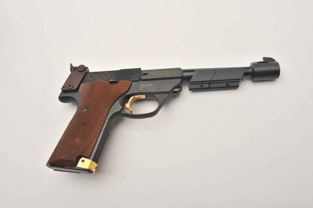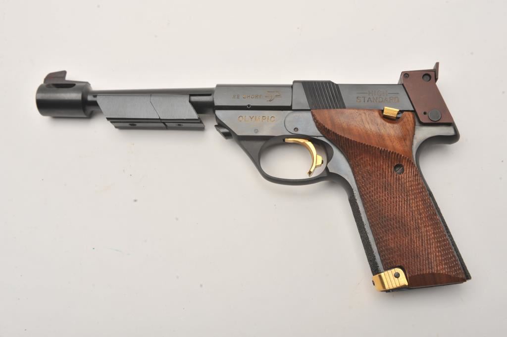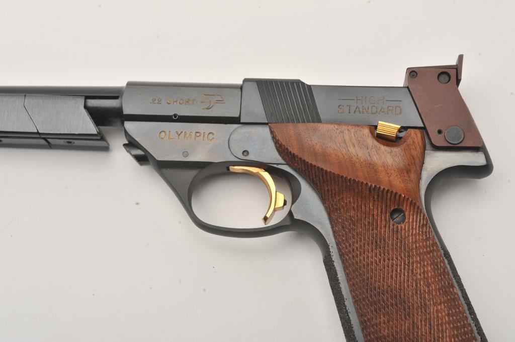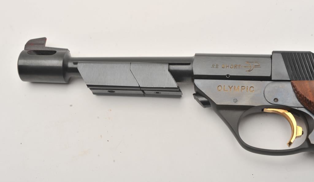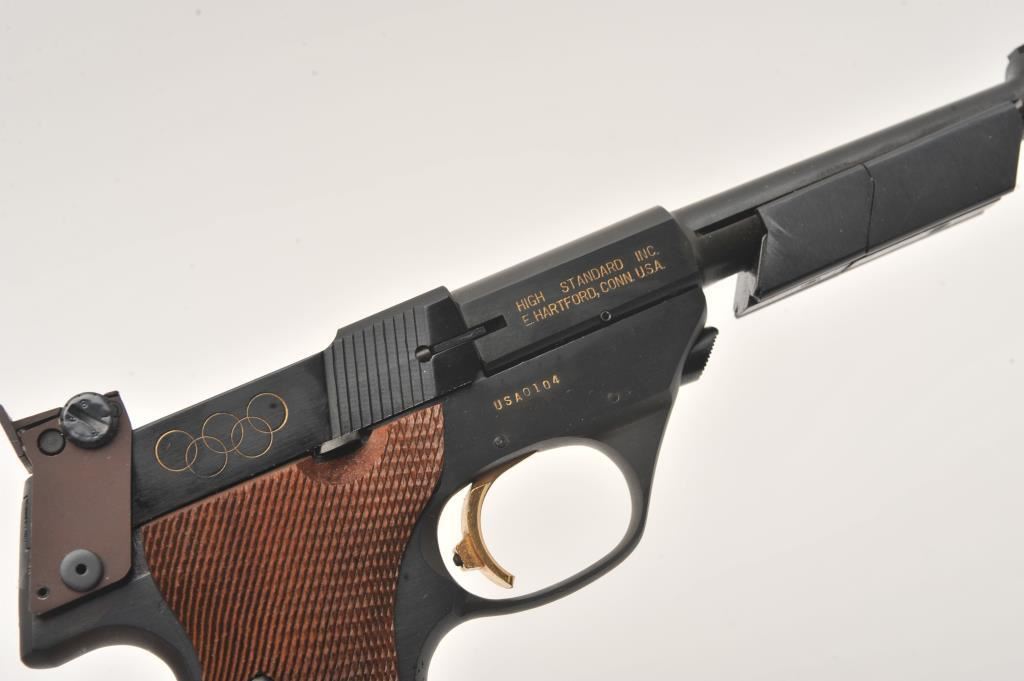 Hi-Standard Olympic, #USA0104, .22 Short cal., 6 3/4" compensated barrel with removable barrel weights, blued finish, adjustable sights, with checkered grips. Pistol is in excellent condition overall, showing 98-99% original finish. The grips are excellent with no chips or cracks. The bore and action are excellent. The Olympic was manufactured to commemorate the win in the 1980 Olympics by a Marine Corps Captain in the pistol accuracy competition at the Moscow games. Includes wooden display box with 1980 Olympic logo and one correct mag. (C&R / PPT) Est. $700-1400