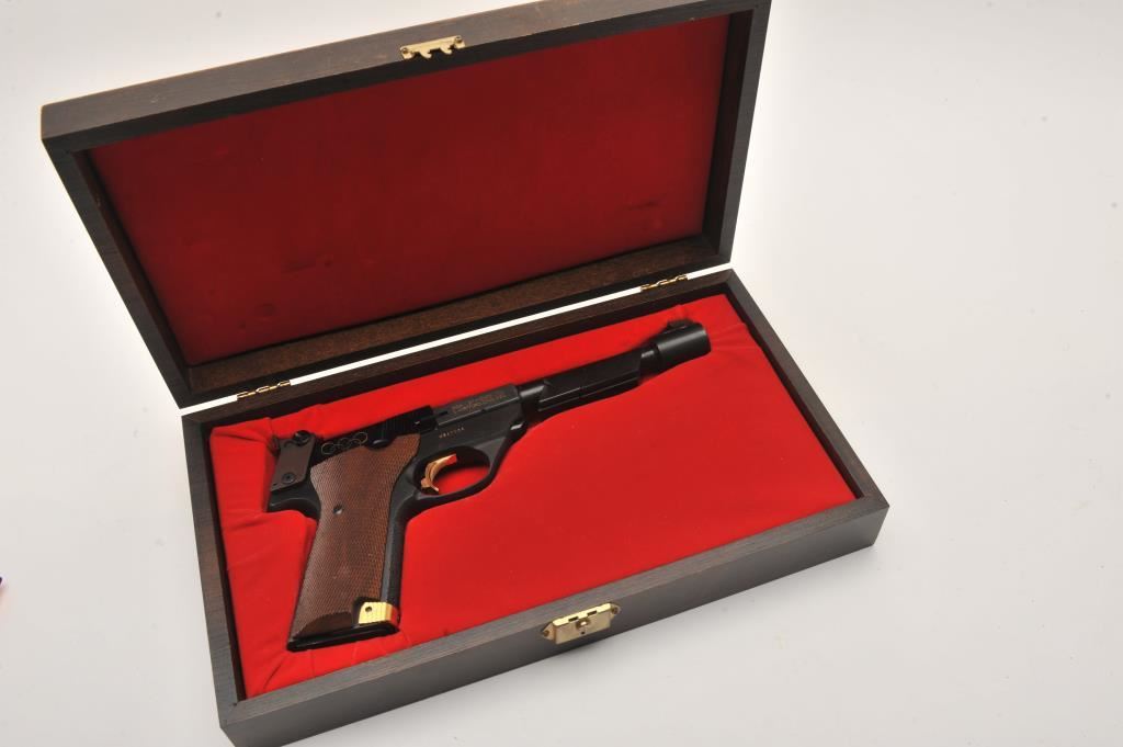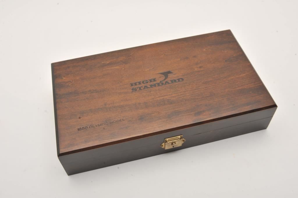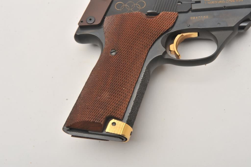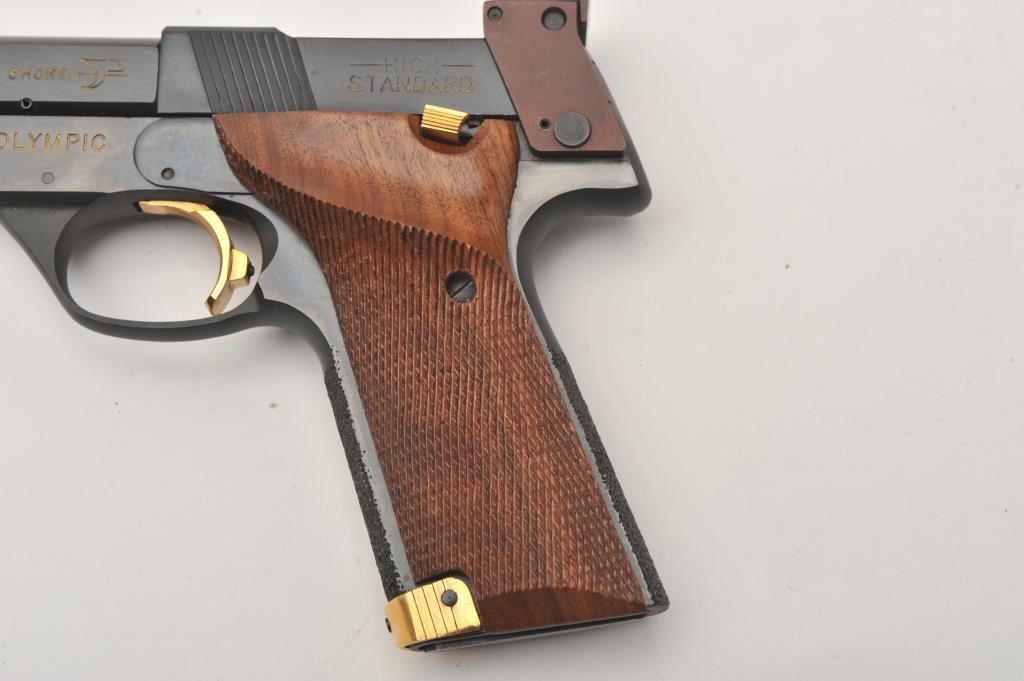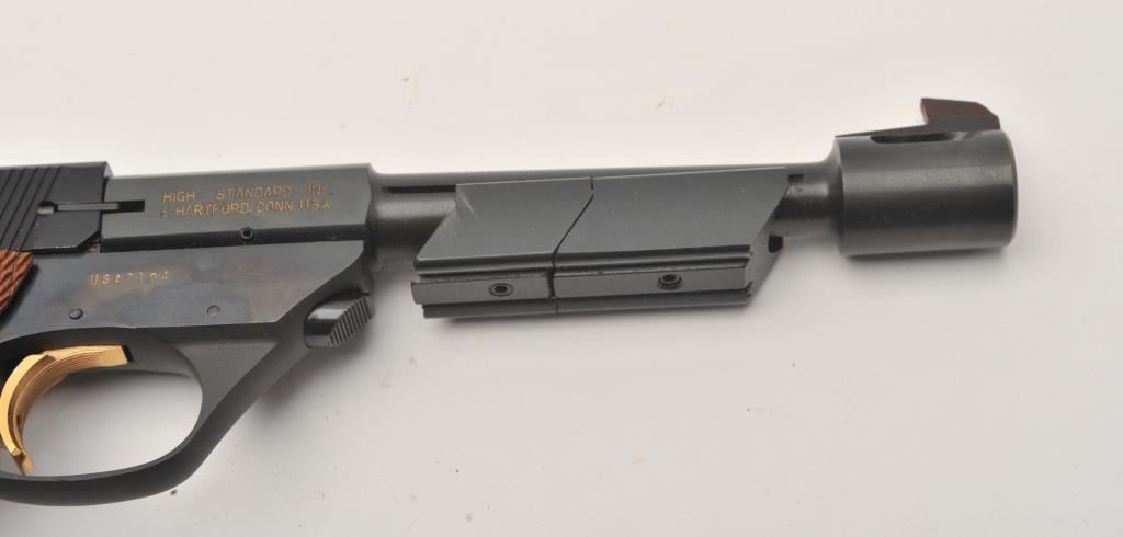 Hi-Standard Olympic, #USA0104, .22 Short cal., 6 3/4" compensated barrel with removable barrel weights, blued finish, adjustable sights, with checkered grips. Pistol is in excellent condition overall, showing 98-99% original finish. The grips are excellent with no chips or cracks. The bore and action are excellent. The Olympic was manufactured to commemorate the win in the 1980 Olympics by a Marine Corps Captain in the pistol accuracy competition at the Moscow games. Includes wooden display box with 1980 Olympic logo and one correct mag. (C&R / PPT) Est. $700-1400