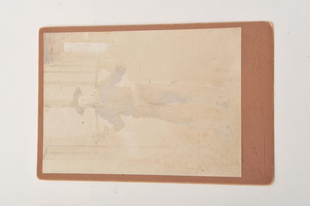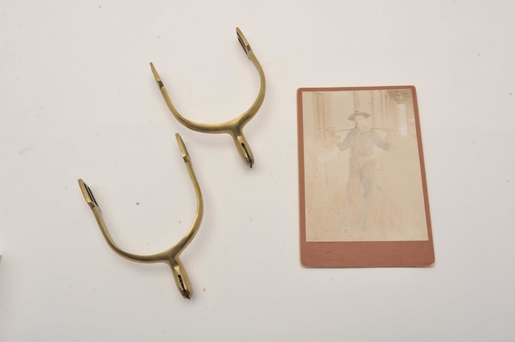 Cabinet photo of Fort Riley Cavalry soldier in protective sleeve plus a pair of 1865 R.I.A.-marked brass spurs. Est.: $150-$300.