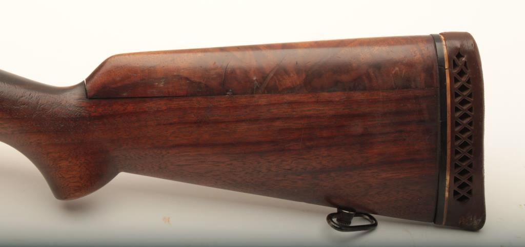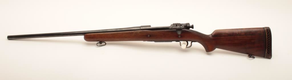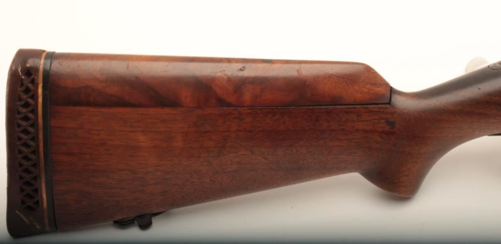Sporterized Springfield Armory 1903 #611372, .30/06 cal., blued finish, wood stock with rubber recoil pad. Rifle is in good condition overall, as refinished and sporterized, bore is fair, stock has been modified and has a cheek piece added to the butt that is not secured (will need gluing). Rubber recoil pad has hardened. Receiver has been drilled and tapped for a scope mount and receiver sight, neither of which are included. (C&R) Est. $150-300