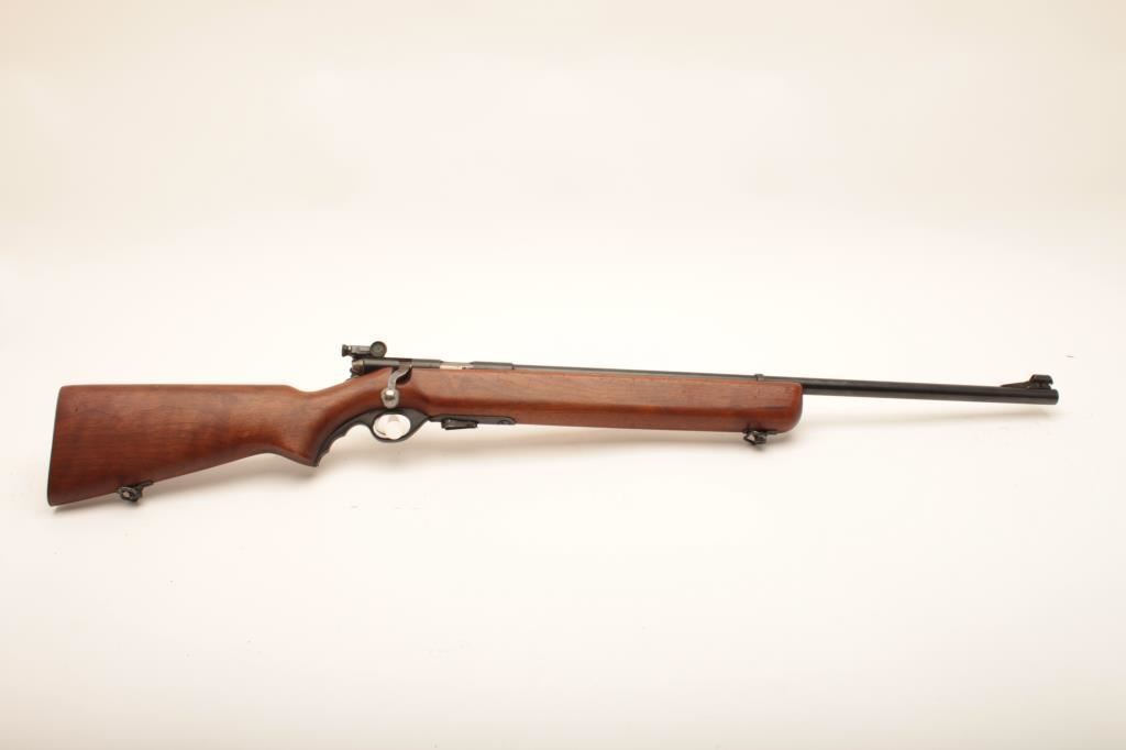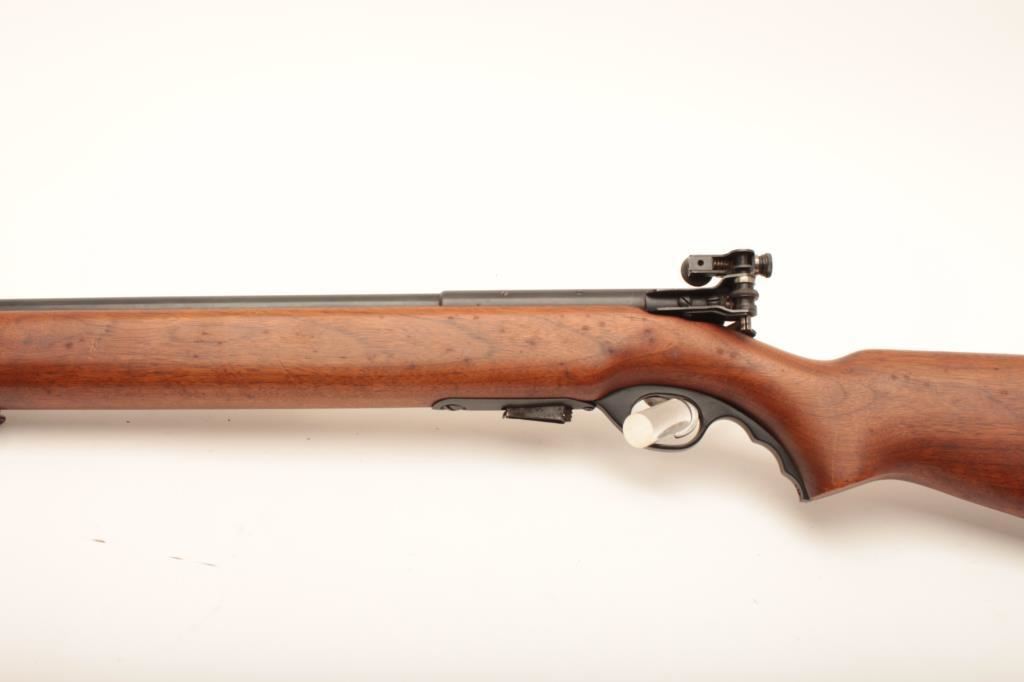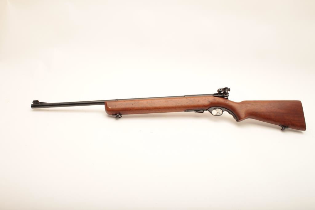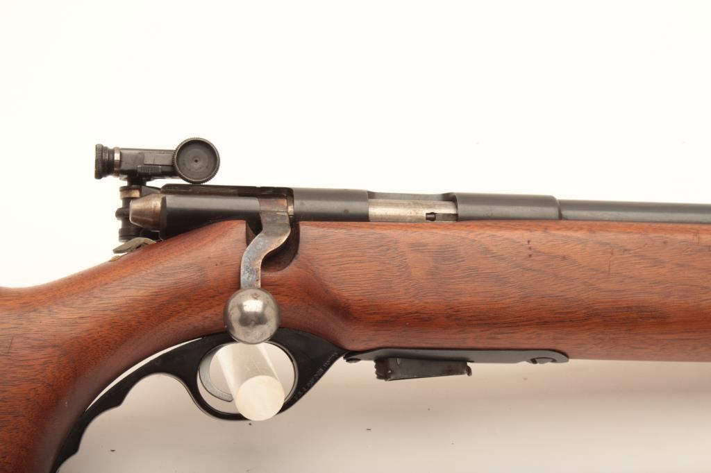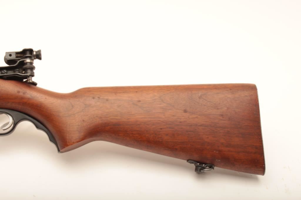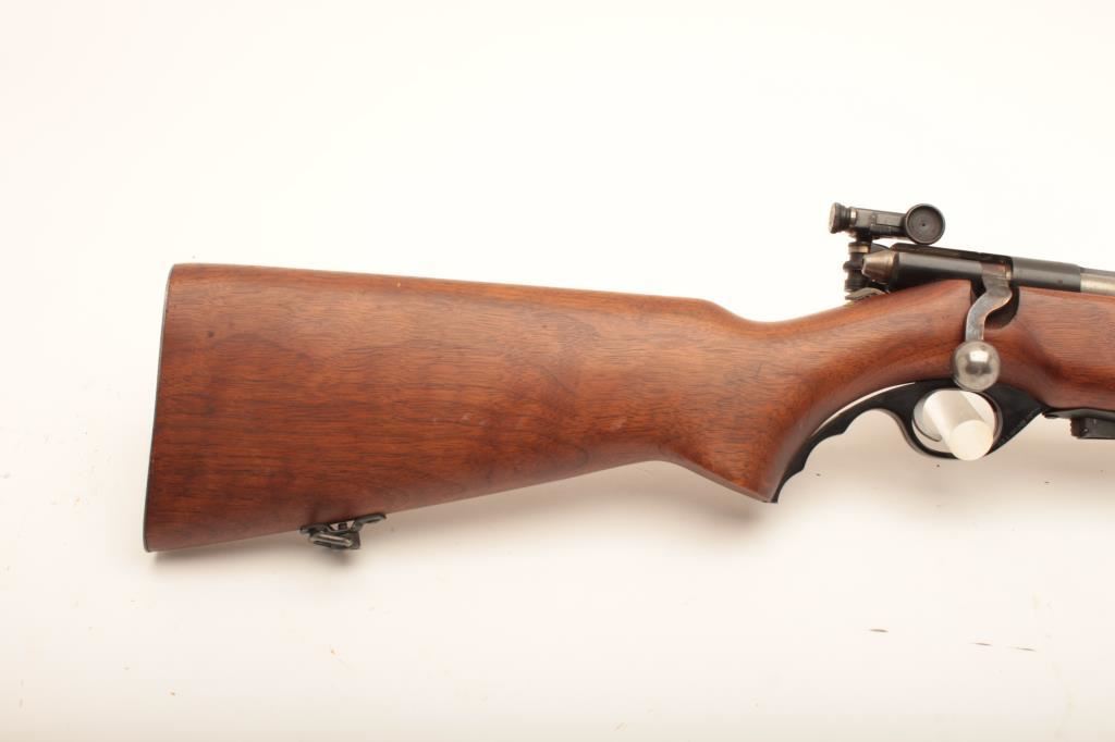 Mossberg 44 US, #NSNV, 22 LR cal., 26 1/4" barrel, blued finih, with smooth walnut stock and Mossberg S-100 receiver sight. Rifle is in very good plus condition overall, retaining the majority of it's original blue finish, the stock is in very good plus condition with no chips or cracks, red "safe" dot is missing. A very nice civilian version of the military trainer. (C&R) Est. $200-400