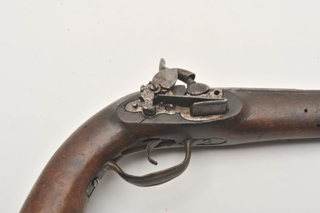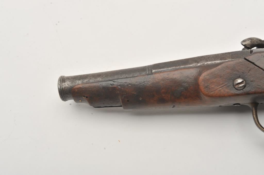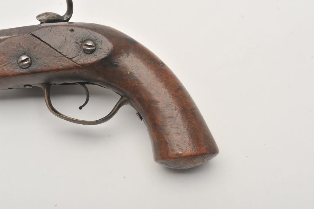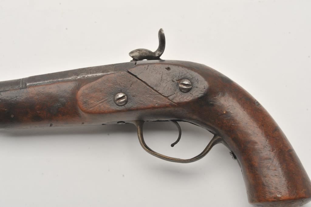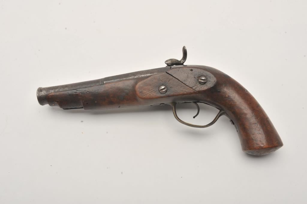 19th Century Spanish Colonial single shot percussion pistol converted from flintlock, approximately .70 caliber. The pistol is in fair overall condition with a 6 ½” octagon to round barrel. The metal surfaces have gone to a brown patina with an illegible proof on top of the barrel flat. The trigger guard is brass and the smooth wood stock show heavy use with a crack at the wrist and the ramrod missing. Est.: $100-$200. (Antique).