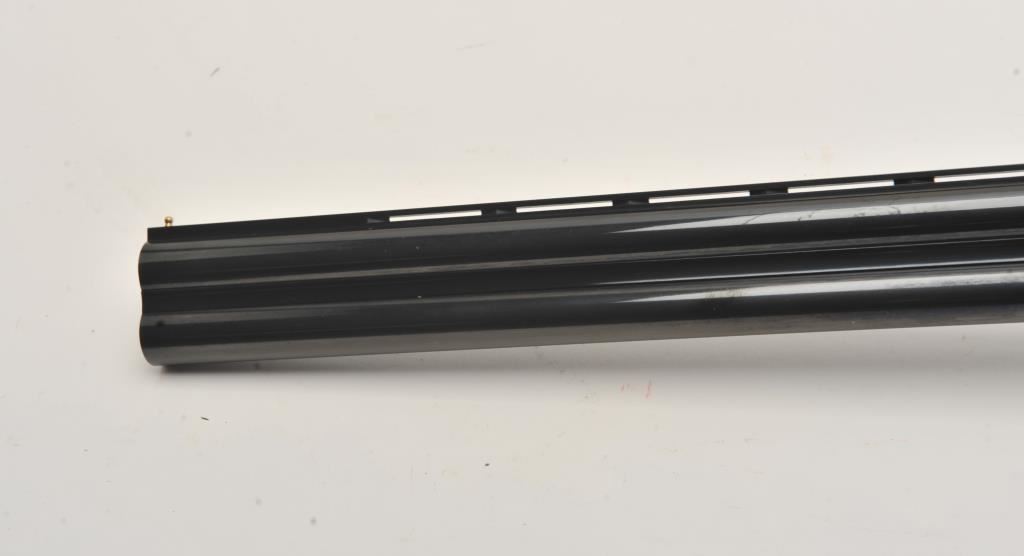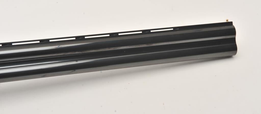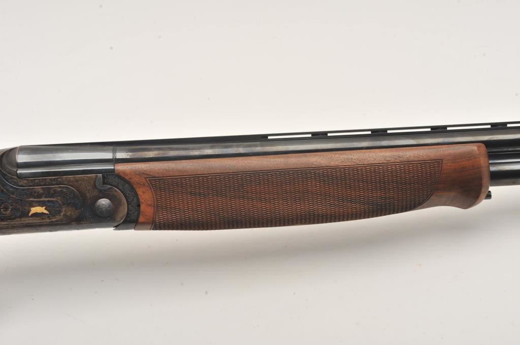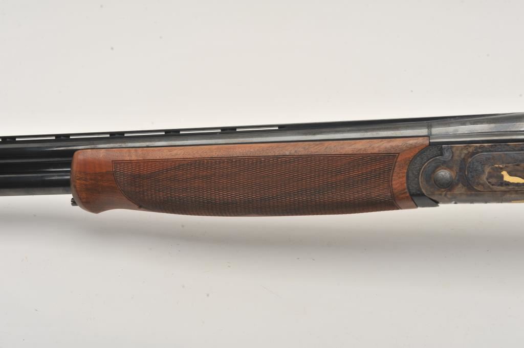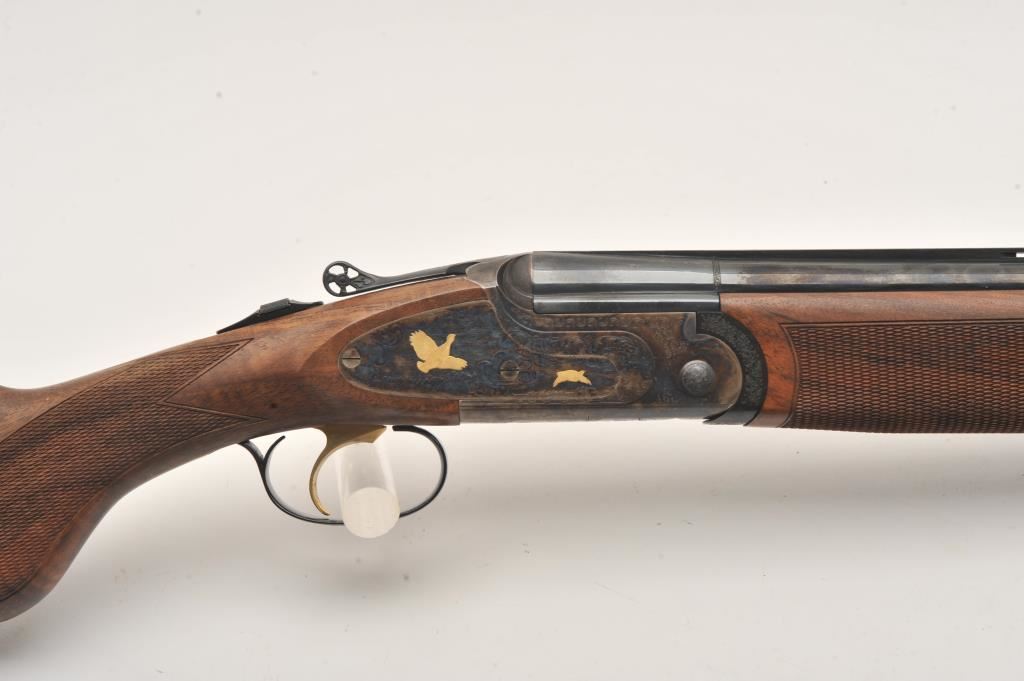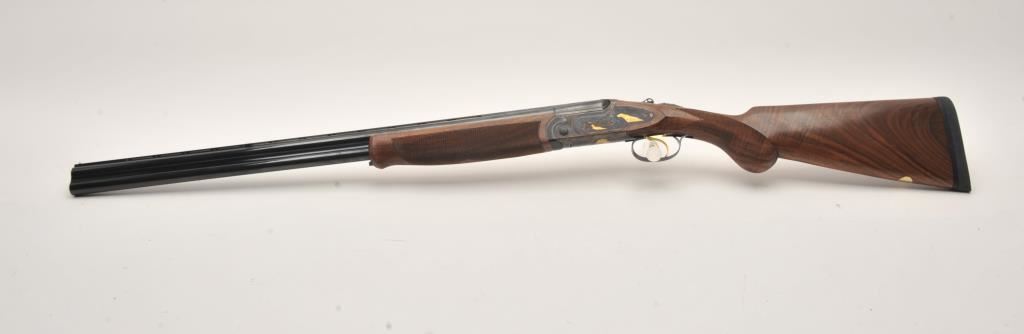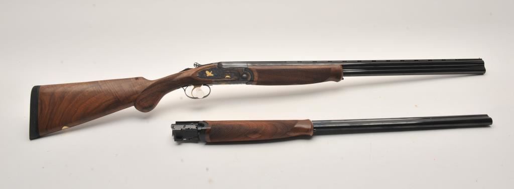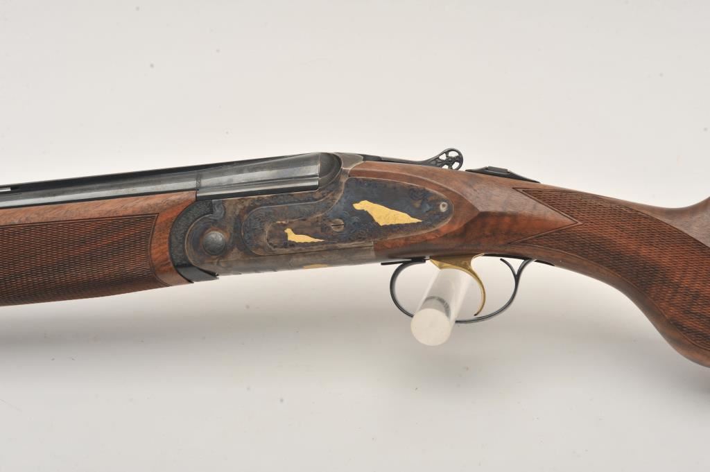 Hi-Grade O/U Italian shotgun by Cortona (Rizzini MFG) 20GA & 28GA two barrel set, S/N 232876 with 28” barrels, single trigger, auto ejectors, low rise vent rib, complete set of screw in chokes and checkered select stocks with round pistol grip. Prestige model with fancy engraving and gold animals. Blue and case colored finish. Measures 14 ¾” to end of rubber pad (Original full length) with original butt plate retained. Fine used condition. 96%-98% overall. Included with Kalispell metal carry case. Retail over $6000 if available and after a long wait. (Modern) Est.: $3750-$7500