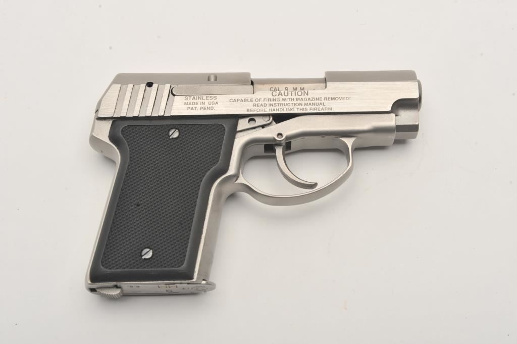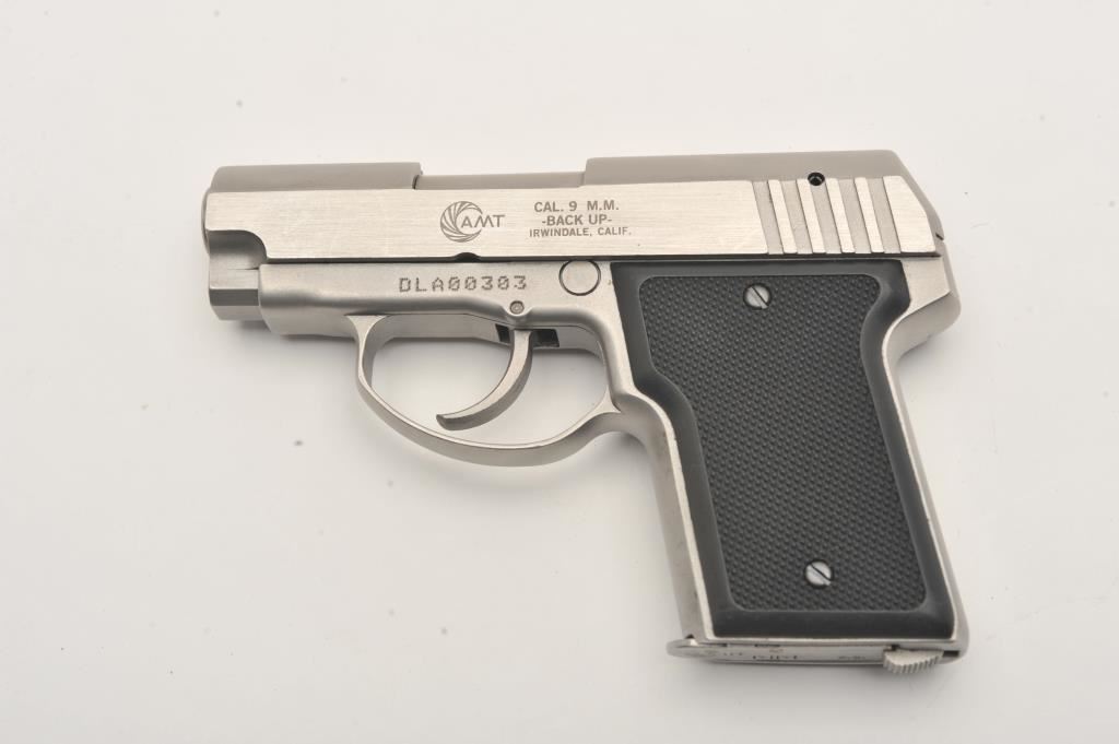 AMT Back Up double action semi-automatic pistol, 9mm caliber, Serial #DLA00303. The pistol is in excellent overall condition with a 3” barrel. The pistol retains nearly all of its matte stainless finish. The checkered plastic grips are in very good condition with sharp checkering showing little use. The bore is very good, the action is crisp and the markings are sharp. Long out of production, these Irwindale manufactured pistols are scarce in this condition. Est.: $300-$600. (Modern/PPT).