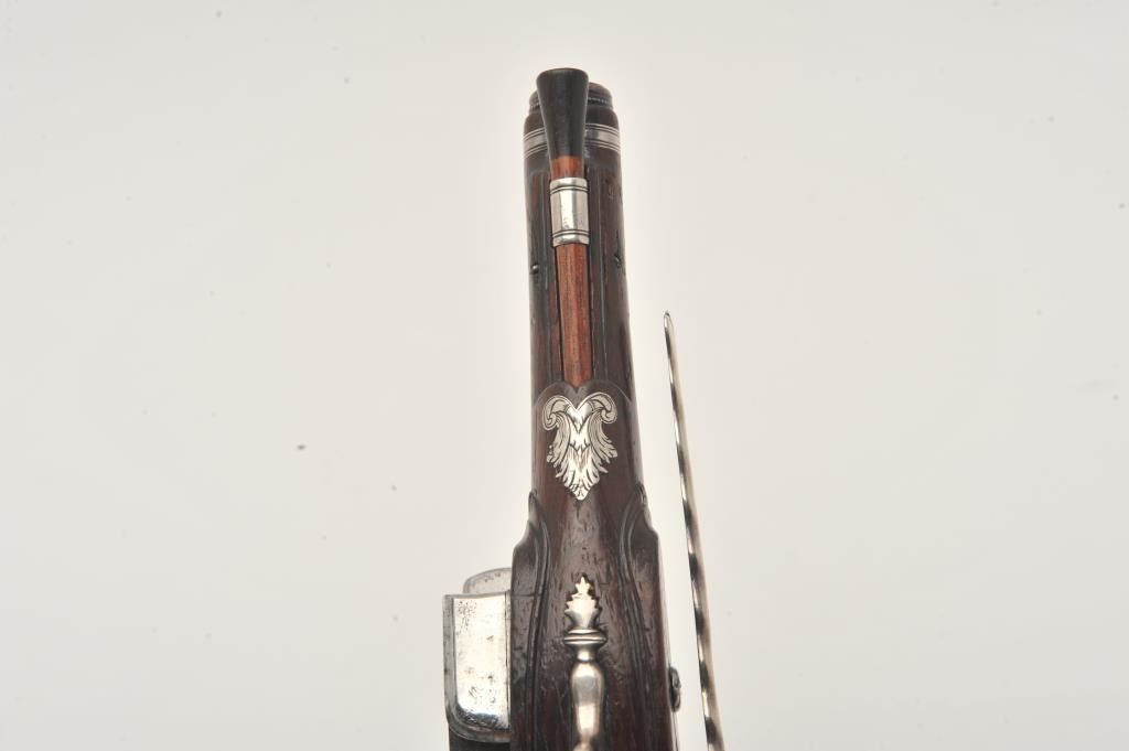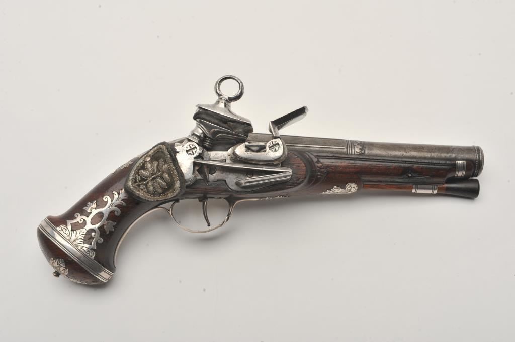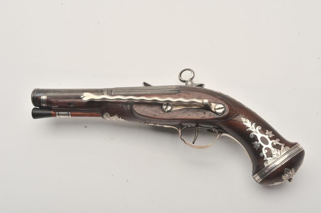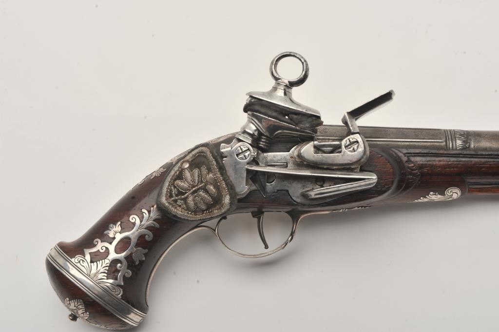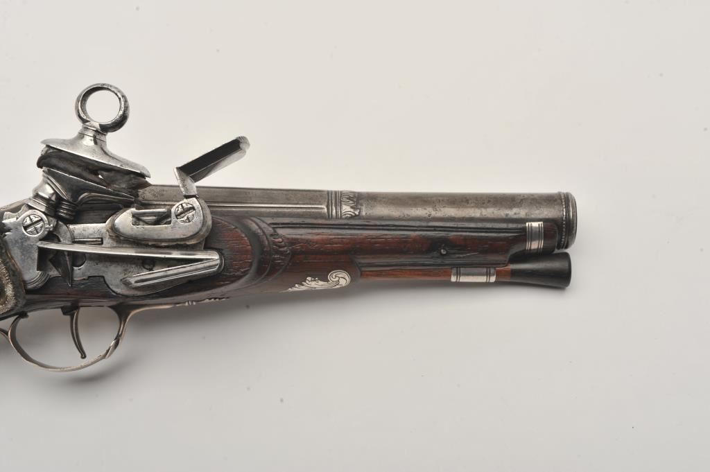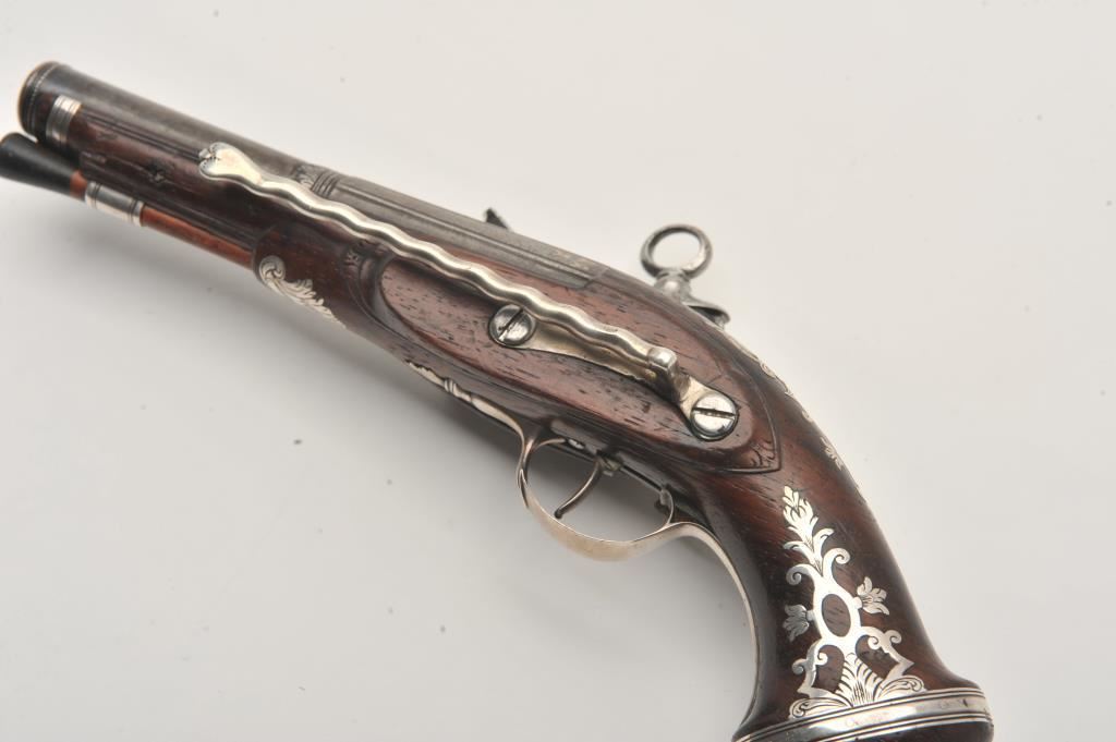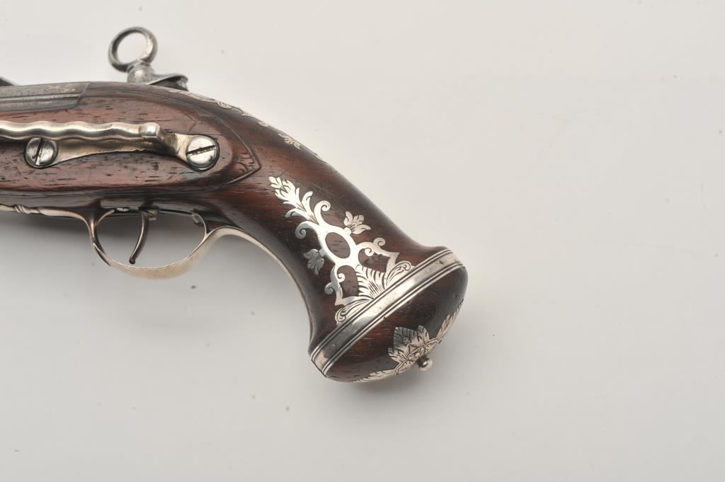 Silver mounted Spanish miquelet belt size pistol showing lion makers mark on breech (Standing and facing left with crown). Formerly Lavin collection and illustrated in work on Spanish arms. Measures 10 ¼” overall with a 5 ¾” barrel of approximately .60 caliber smoothbore. Two stage barrel with ringed cannon style muzzle. Full silver mounts and pierced grip inlay with fancy period belt hook retained. Also silver embroidered material attached at the rear of the hammer to protect hand from being pinched by action (rare). The condition is very good plus with horn tipped ramrod of correct style. A gem from the prominent expert’s collection. (Antique) Est.: $2000-$4000