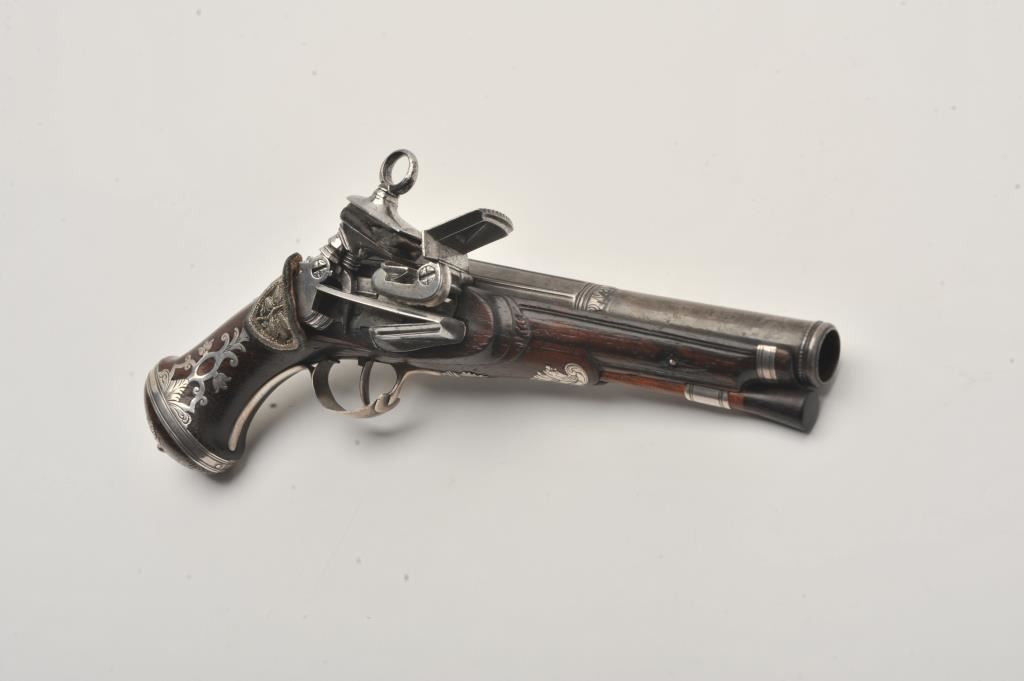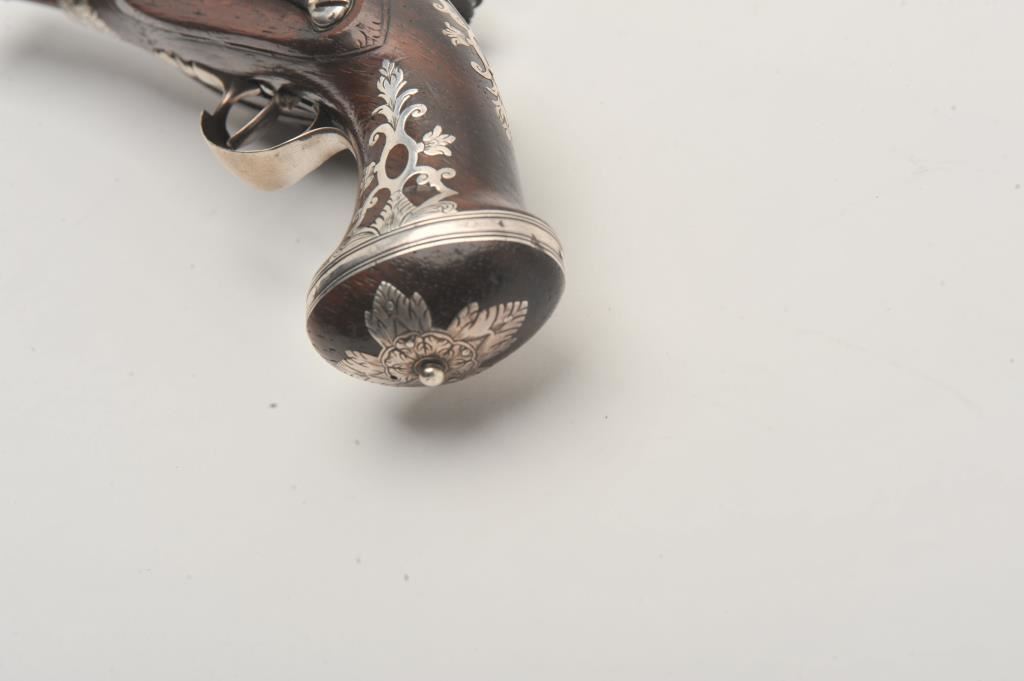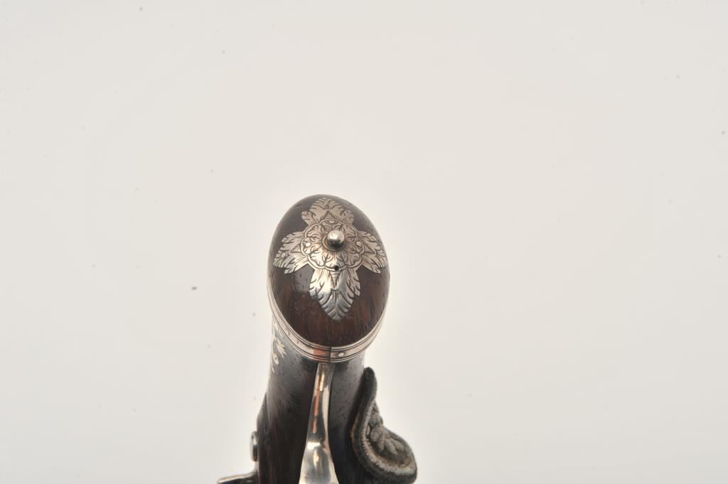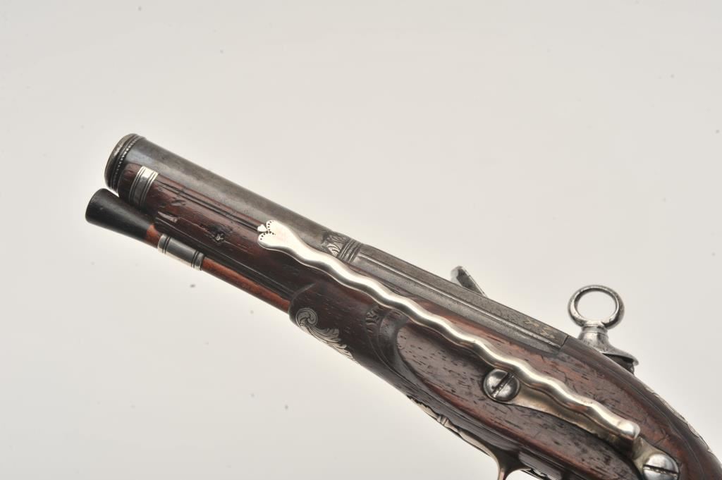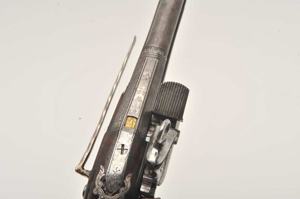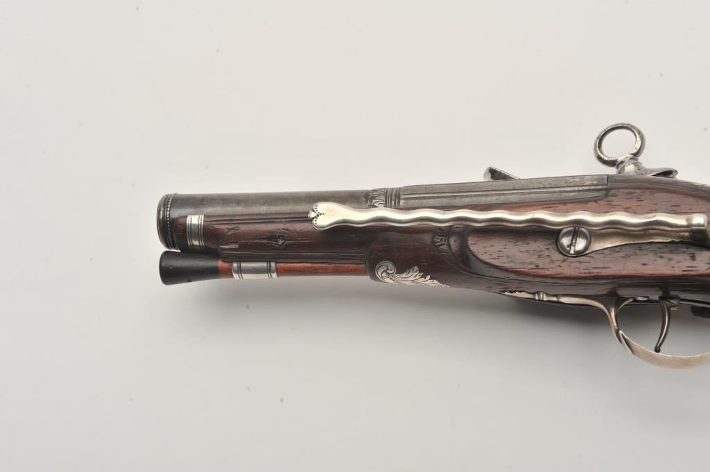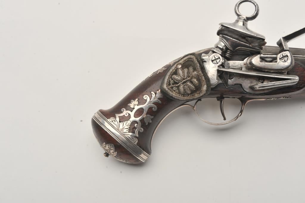Silver mounted Spanish miquelet belt size pistol showing lion makers mark on breech (Standing and facing left with crown). Formerly Lavin collection and illustrated in work on Spanish arms. Measures 10 ¼” overall with a 5 ¾” barrel of approximately .60 caliber smoothbore. Two stage barrel with ringed cannon style muzzle. Full silver mounts and pierced grip inlay with fancy period belt hook retained. Also silver embroidered material attached at the rear of the hammer to protect hand from being pinched by action (rare). The condition is very good plus with horn tipped ramrod of correct style. A gem from the prominent expert’s collection. (Antique) Est.: $2000-$4000