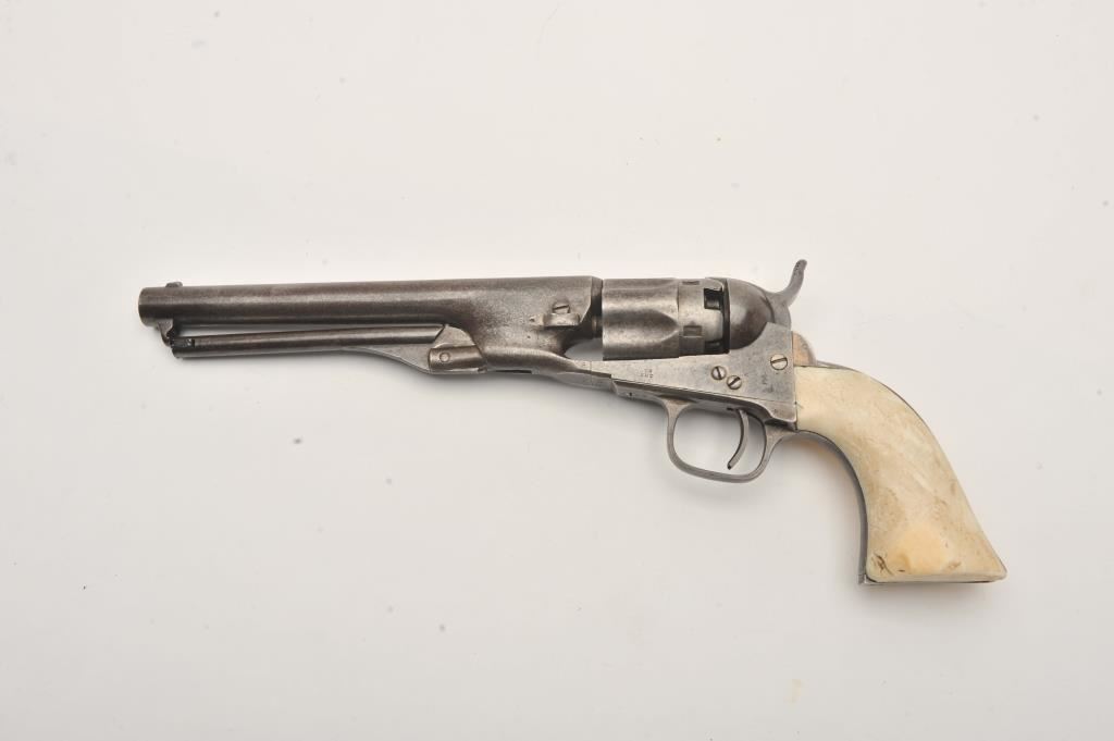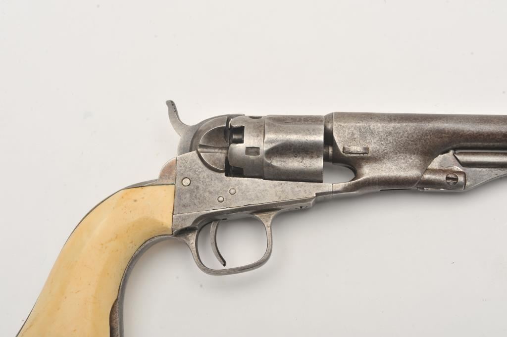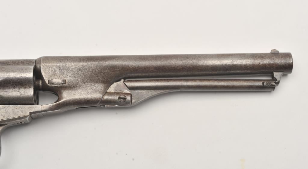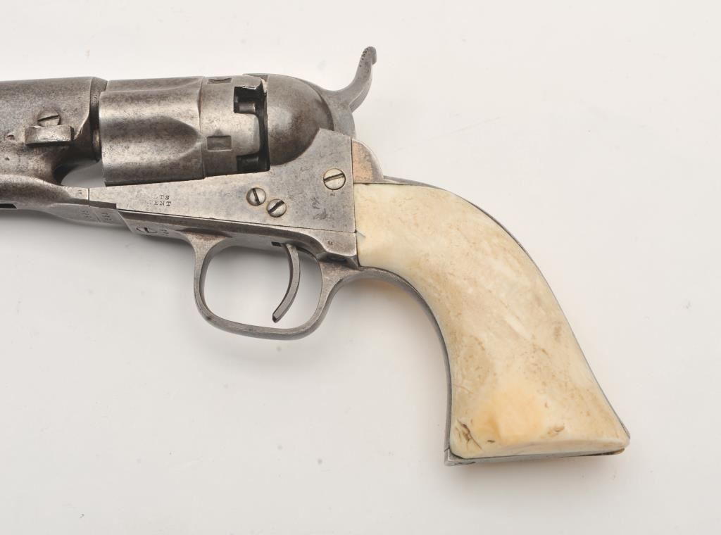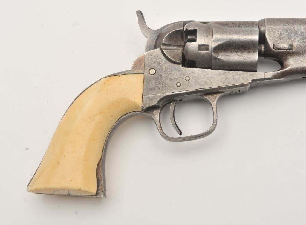 Colt 1862 Police .36 caliber percussion with 6 ½” barrel and scarce iron guard and back strap, S/N 595 with Hartford address. Light gray brown patina with minor erosion and surface pitting. The marking is light but visible. All matching. Grips show 1 large chip missing at the left toe otherwise good and genuine to the period of manufacturing. The patent is sharp on the cylinder. (Antique) Est.: $1500-$3000