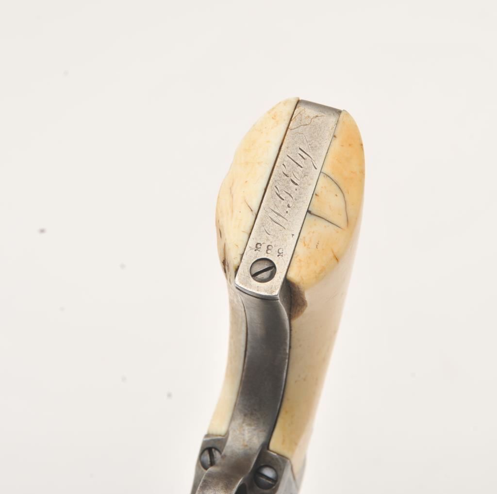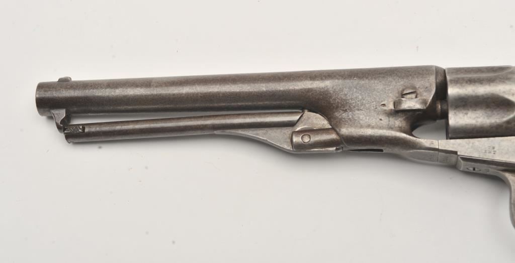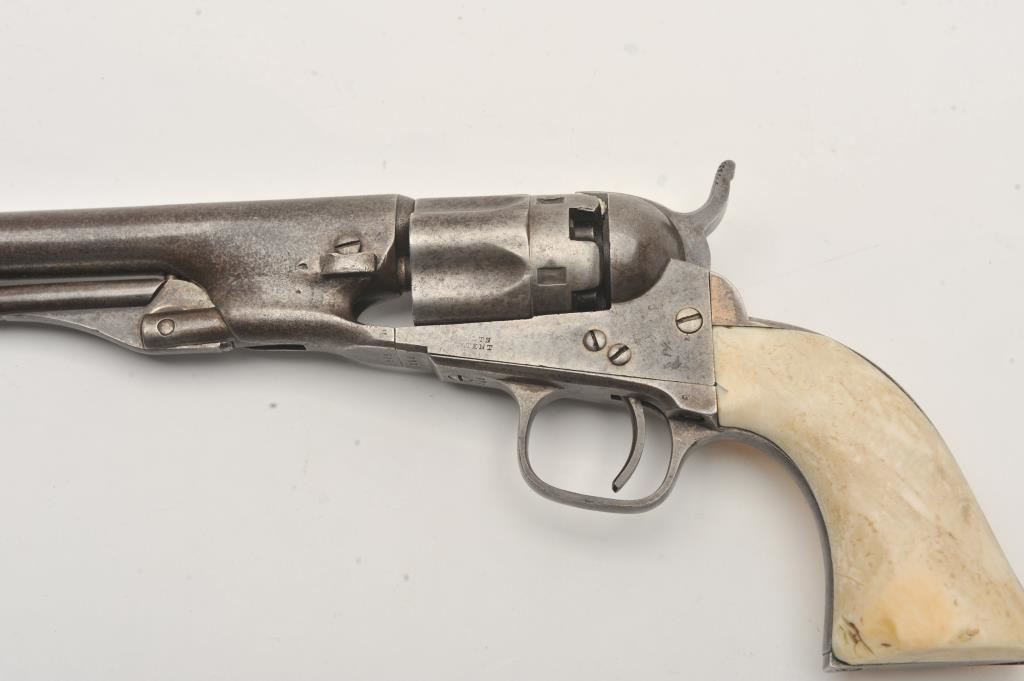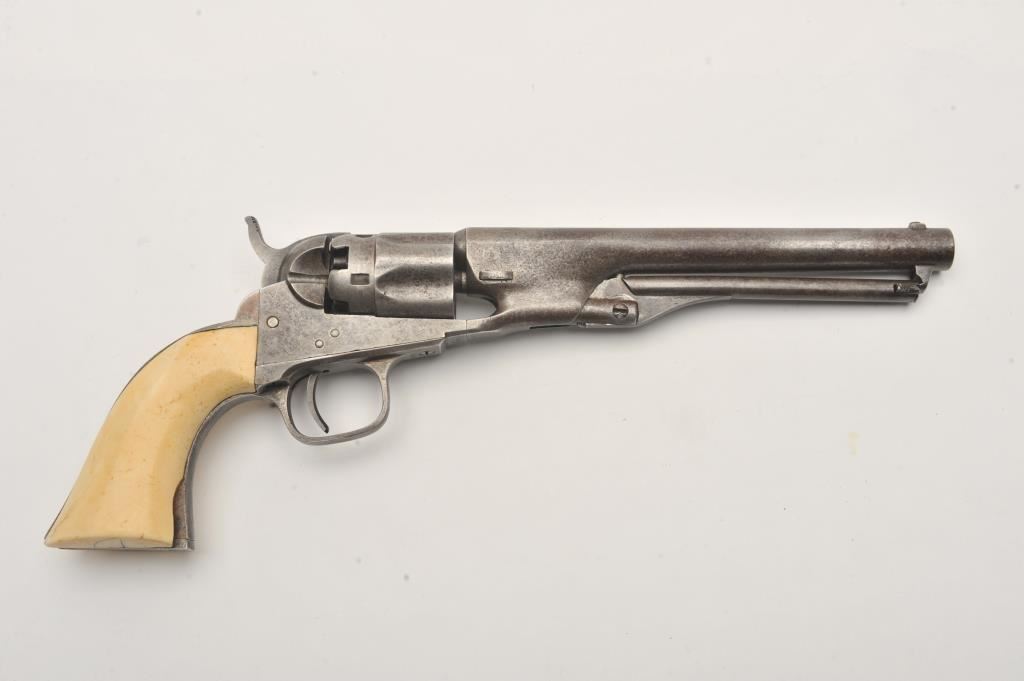 Colt 1862 Police .36 caliber percussion with 6 ½” barrel and scarce iron guard and back strap, S/N 595 with Hartford address. Light gray brown patina with minor erosion and surface pitting. The marking is light but visible. All matching. Grips show 1 large chip missing at the left toe otherwise good and genuine to the period of manufacturing. The patent is sharp on the cylinder. (Antique) Est.: $1500-$3000