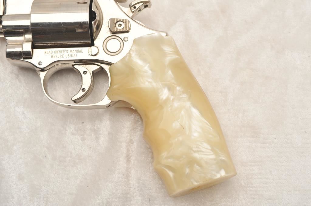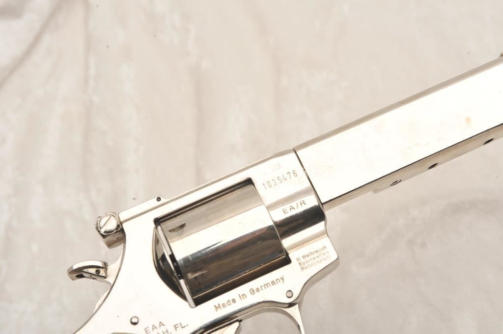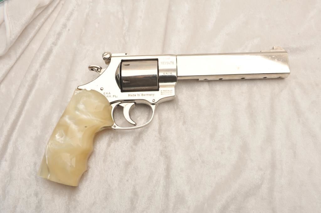 Pair of EAA double action revolvers in .357 mag, nickel finish, 6” barrel, faux pearl grips, S/N 1035489 & 1035476. Shows use and firing blanks in the movie. Stembridge Gun Rentals Auction used by Tommy Lee Jones in “Batman Forever” Lot 120 of epic sale of arms June 5, 2007. With original certificate from Little John’s. (C&R) Est.: $2000-$4000