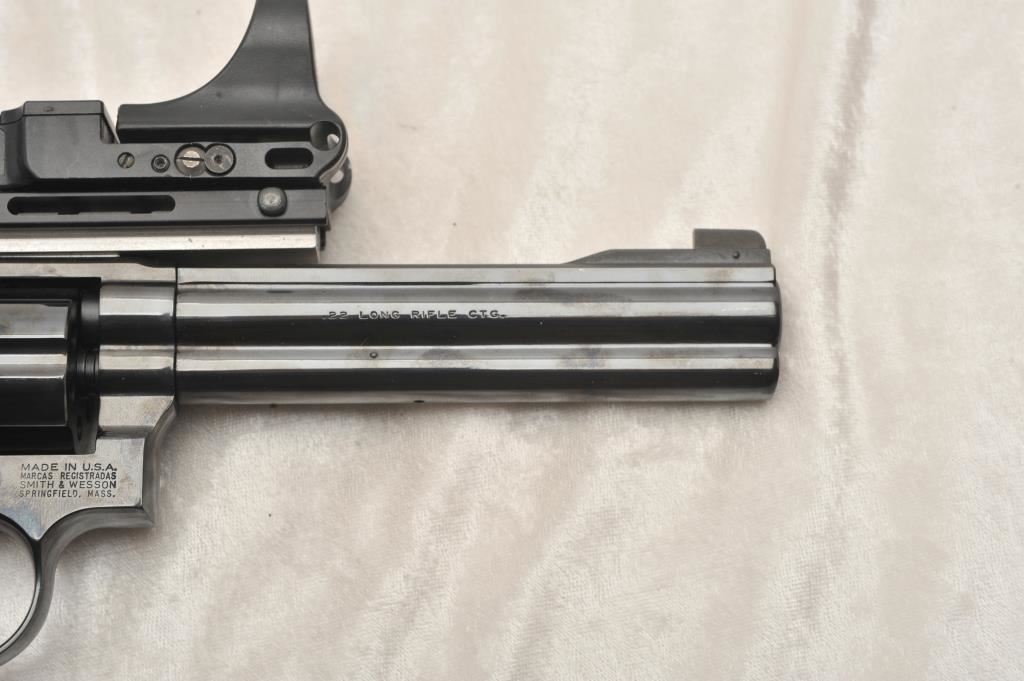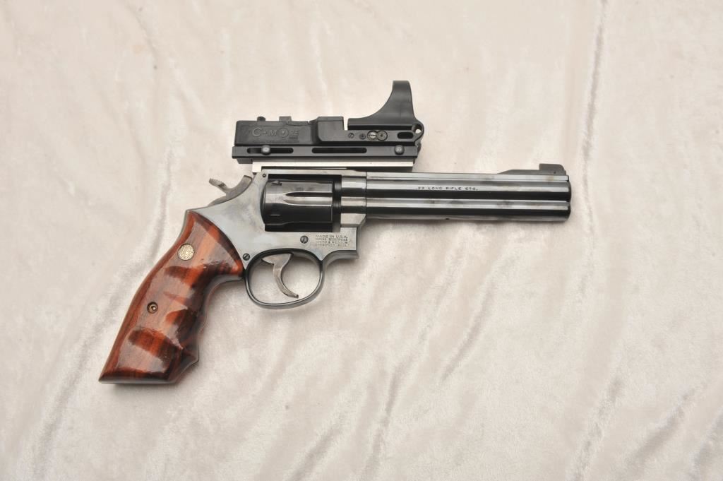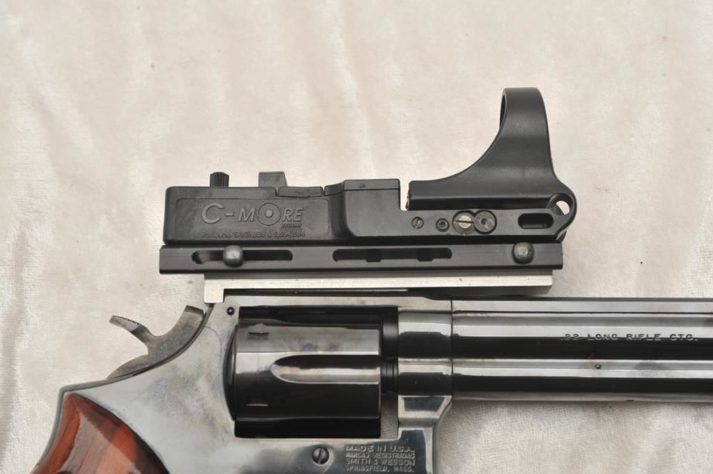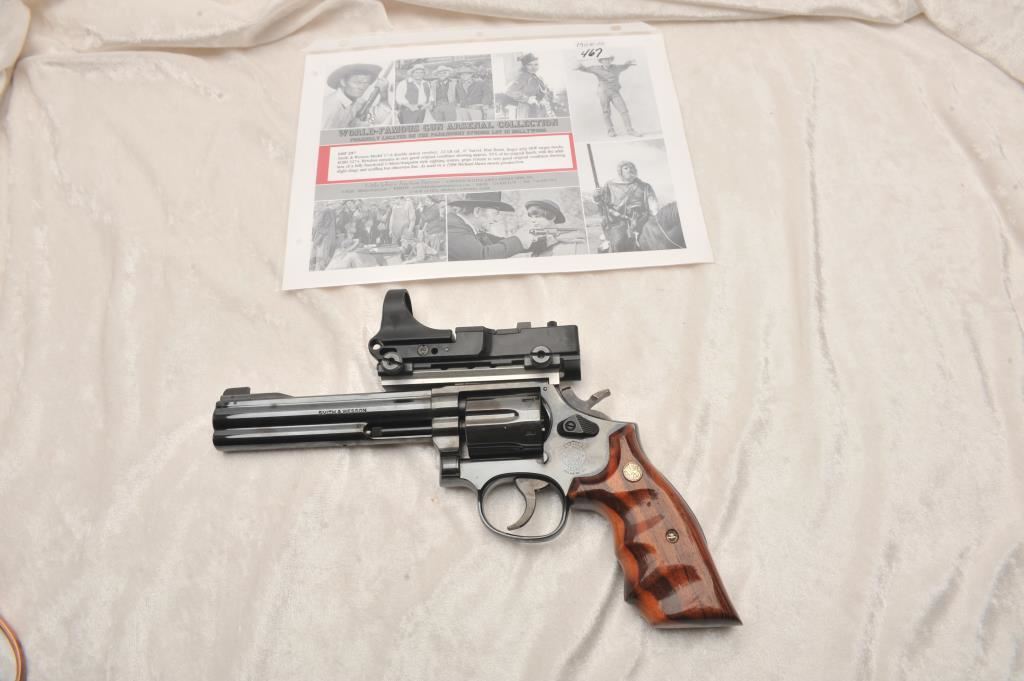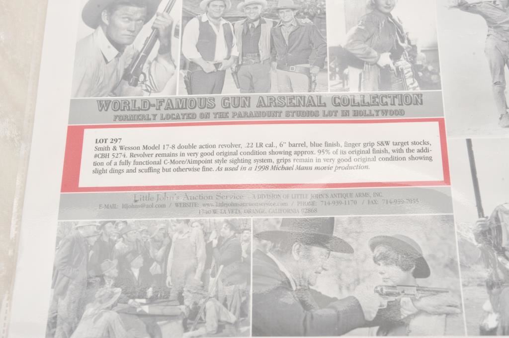 Smith & Wesson Model 17-8 double action revolver, .22 LR caliber, 6” barrel, blue finish, finger grip S&W target stocks, S/N CBH5274. Revolver remains in very good original condition showing approximately 95% of its original finish, with the addition of a fully functional C-More/Aimpoint style sighting system, grips remain in very good original condition showing slight dings and scuffling but otherwise fine. As sued in a 1998 Michael Mann movie production. Stembridge Gun rentals auction Lot 297 of epic sale of arms June 5, 2007. With original certificate from Little John’s. (C&R) Est.: $750-$1500