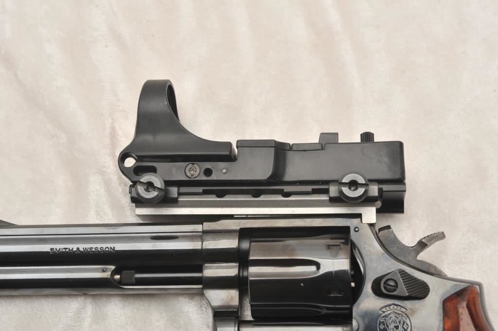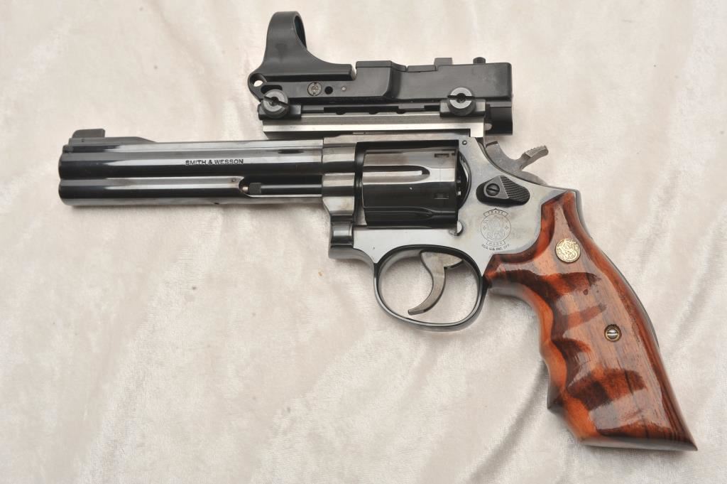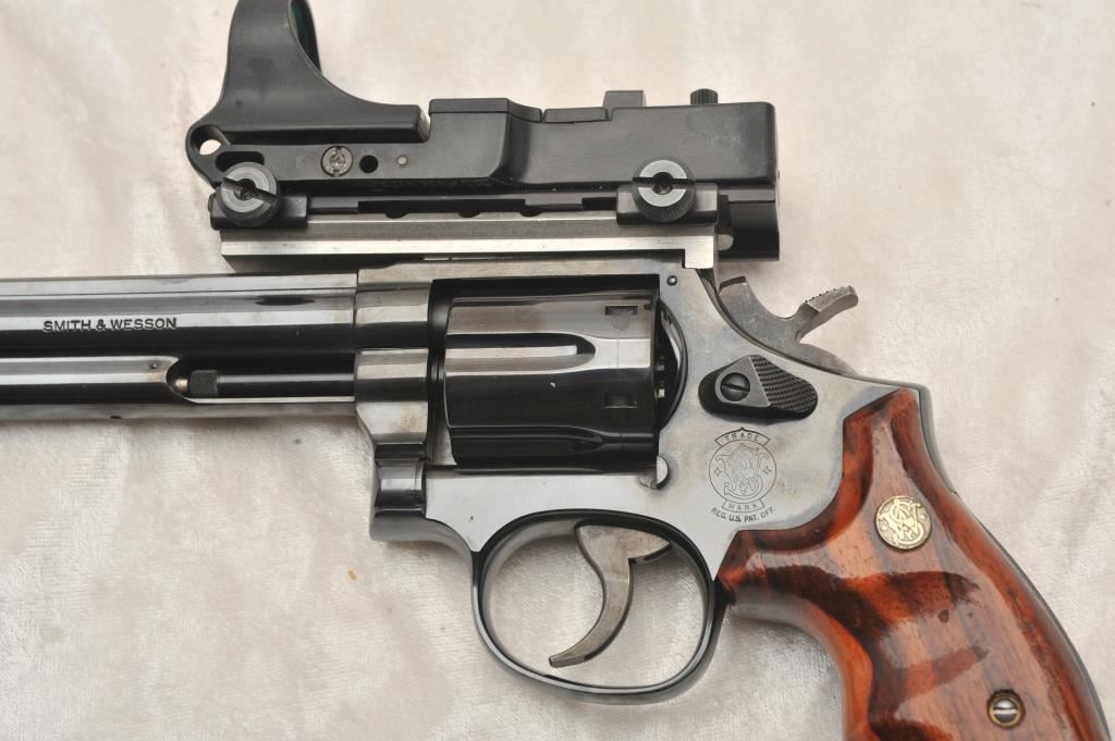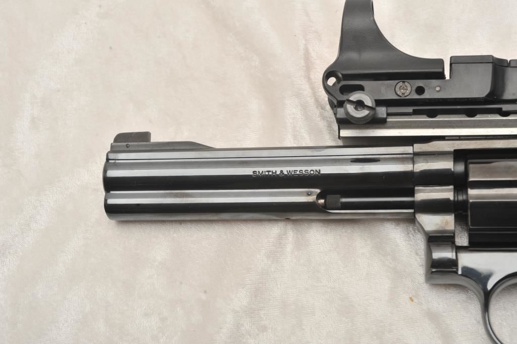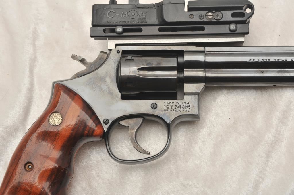 Smith & Wesson Model 17-8 double action revolver, .22 LR caliber, 6” barrel, blue finish, finger grip S&W target stocks, S/N CBH5274. Revolver remains in very good original condition showing approximately 95% of its original finish, with the addition of a fully functional C-More/Aimpoint style sighting system, grips remain in very good original condition showing slight dings and scuffling but otherwise fine. As sued in a 1998 Michael Mann movie production. Stembridge Gun rentals auction Lot 297 of epic sale of arms June 5, 2007. With original certificate from Little John’s. (C&R) Est.: $750-$1500