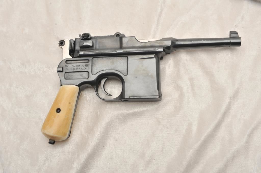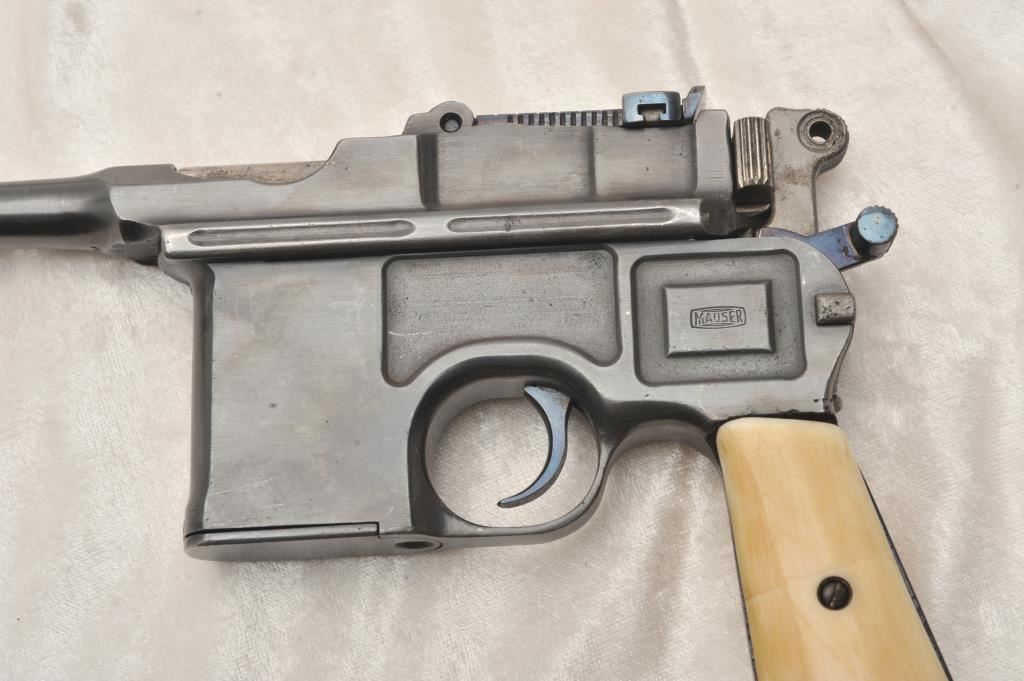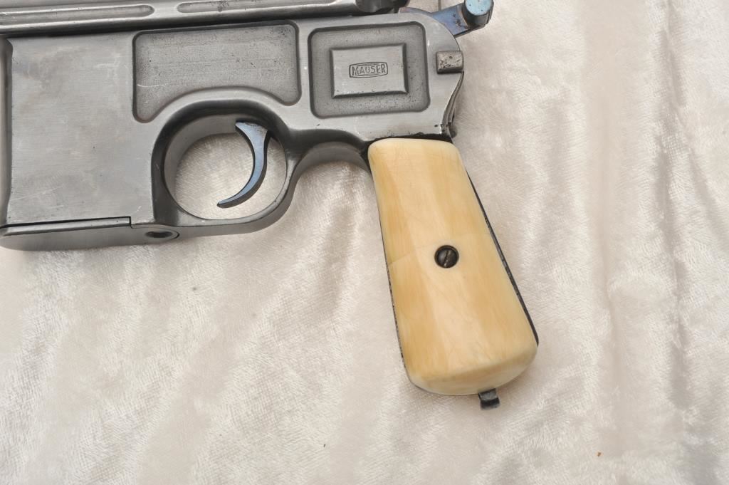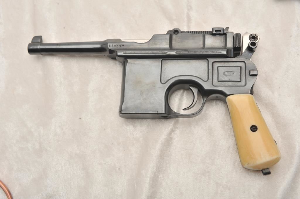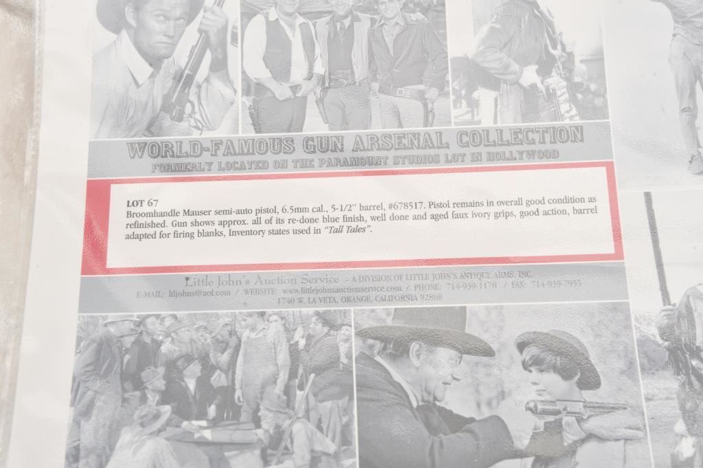 Pair of broom handle Mauser semi-auto pistols, 6.5mm caliber, 5 ½” barrel, S/N 692751 & 678517. The Pistol remains in overall good condition as refinished. Gun shows approximately all of its re-done blue finish, well done and aged faux ivory grips, good action, barrel adapted for firing blanks. From the Stembridge Arms inventory, however S/N 692751 has no further attribution to particular movie or T.V show available but inventory for S/N 678517 states it was used in “Tall Tales’. Lot 66 & 67 of epic sale of arms June 5, 2007. With original certificate from Little John’s. (C&R) Est.: $1000-$2000