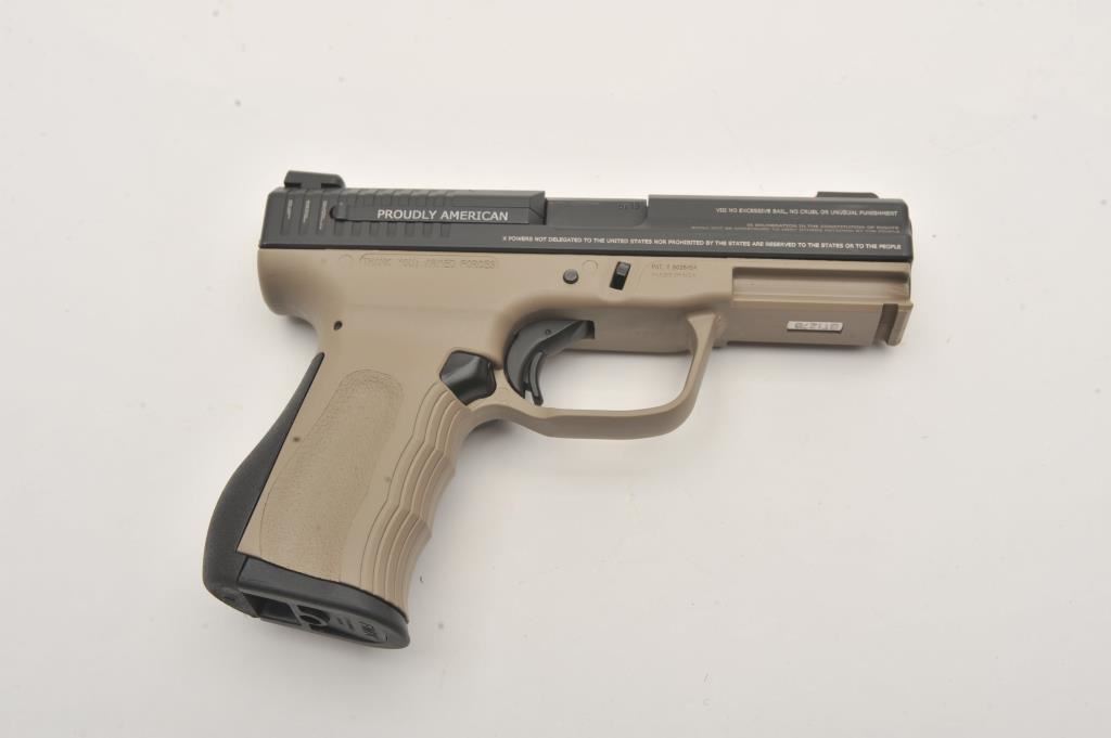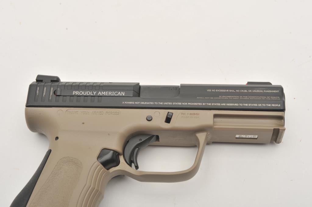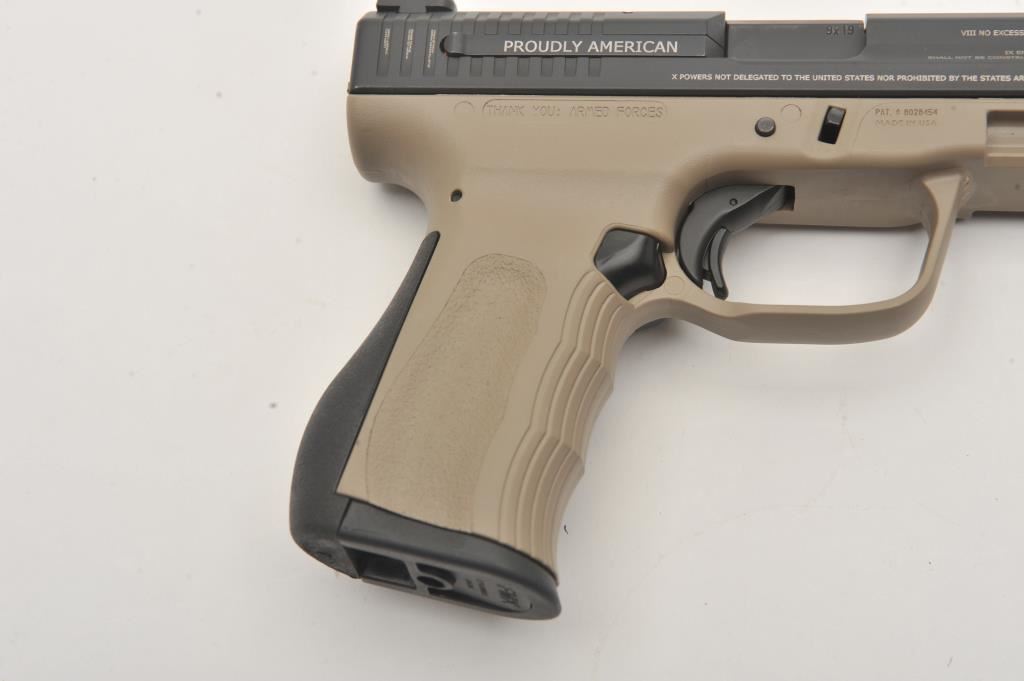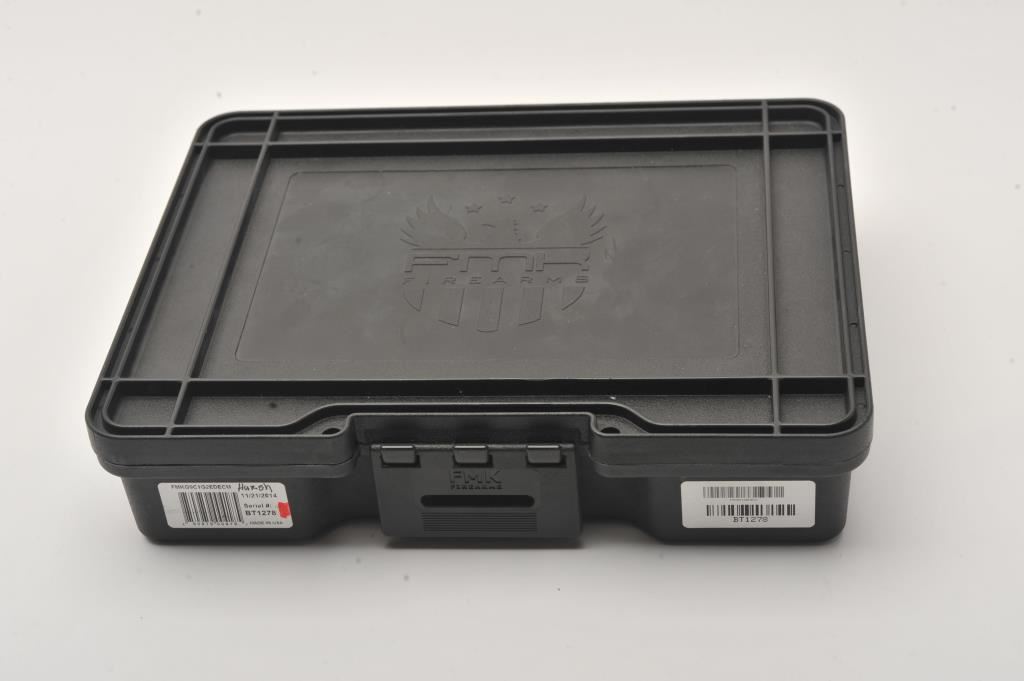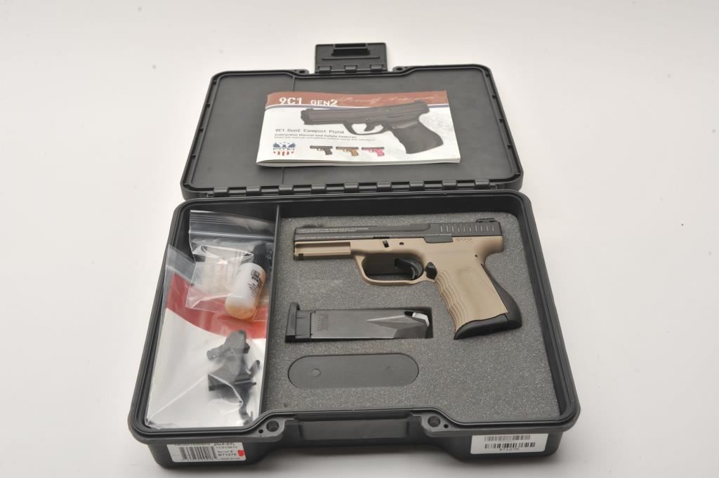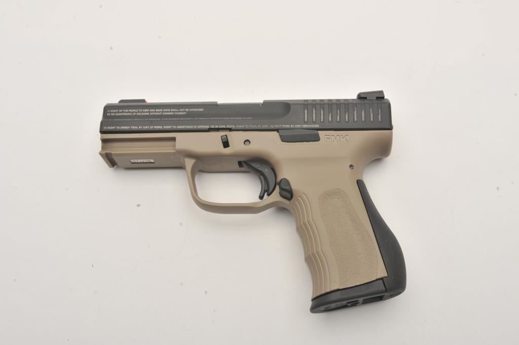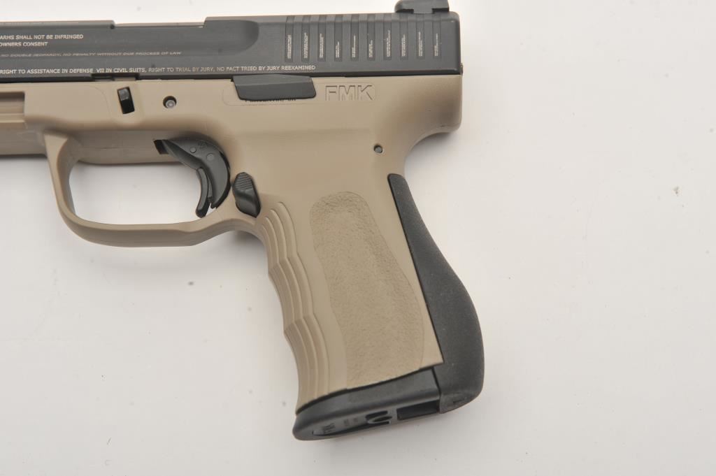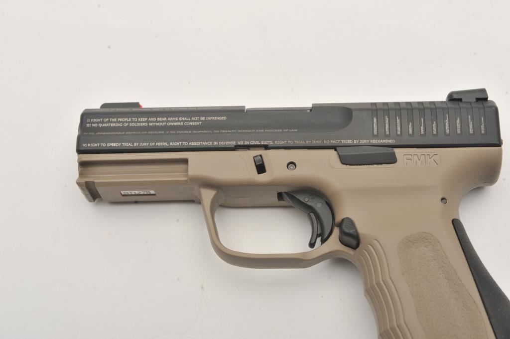 FMK Model 9C1 G2 semi-automatic pistol, 9mm caliber, Serial #BT1278. The pistol is as new in the factory case with a 4” barrel. The slide retains nearly all of its matte blue finish with the Bill of Rights and In God We Trust inscribed on the sides and top. The frame is finished in Flat Dark Earth (FDE) and night sights have been added. The textured plastic grips are in excellent condition showing little use with a rubber insert along the back strap. The bore is very good, the action is crisp and the markings are sharp. The lot includes the factory hard case with two correct magazines, extra trigger assembly and manual. Manufactured in Placentia, these patriotic themed pistols are made in the USA. Est.: $250-$500. (Modern/PPT).