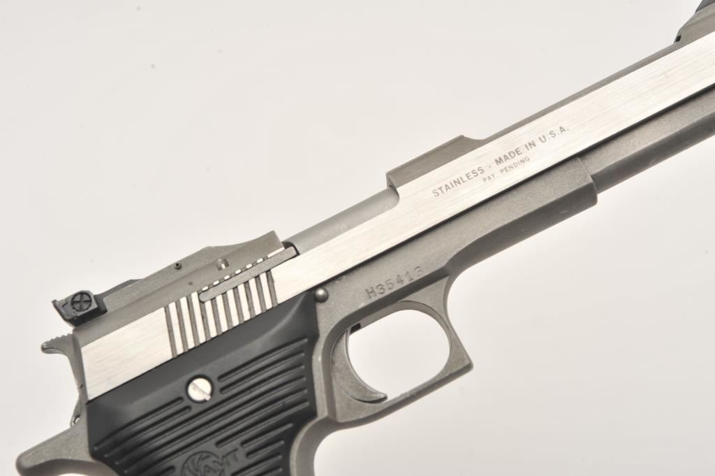 AMT Auto Mag II semi-automatic pistol, .22 Magnum caliber, Serial #H35413. The pistol is in excellent overall condition with a 6” barrel with a red ramp front and adjustable rear sights. The pistol retains nearly all of its stainless steel finish with only handling marks. The textured plastic grips are in very good condition showing little use. The bore is very good, the action is crisp and the markings are sharp on this Irwindale marked AMT which is long out of production. The pistol comes with one correct magazine in a plastic hard case. Est.: $300-$600. (Modern/PPT).