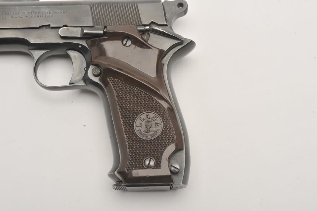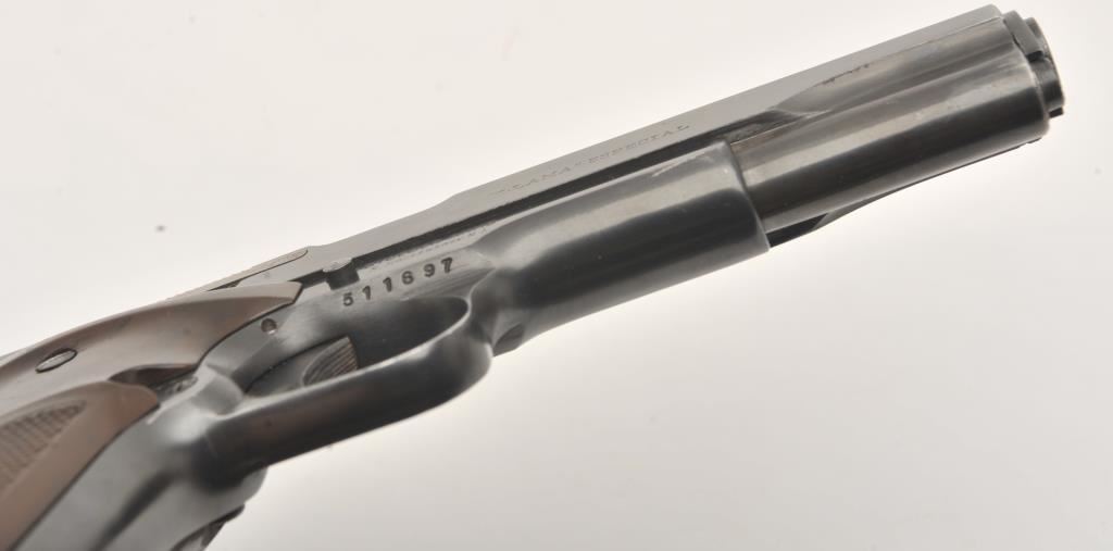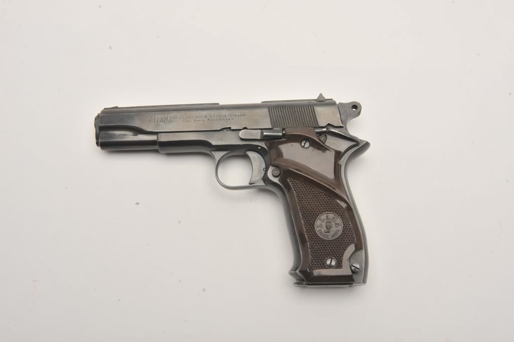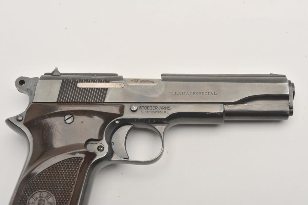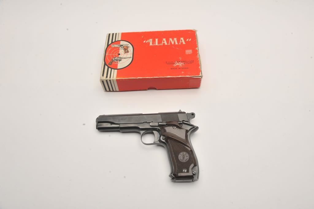 Llama Especial semi-automatic pistol, 9mm caliber, Serial #511697. The pistol is in very good overall condition with a 4 ½” barrel. The pistol retains nearly all of its blue finish with high point edge wear and some abrasions at the muzzle. The frame is imported marked on the right side and marked, “MADE IN SPAIN” at the magazine well. The checkered plastic grips are in good condition with small mars from carry and use. The bore is good, the action crisp and markings are sharp on this early Llama with its original factory cardboard box. The lot includes one correct magazine. Est.: $300-$600. (C+R/PPT).