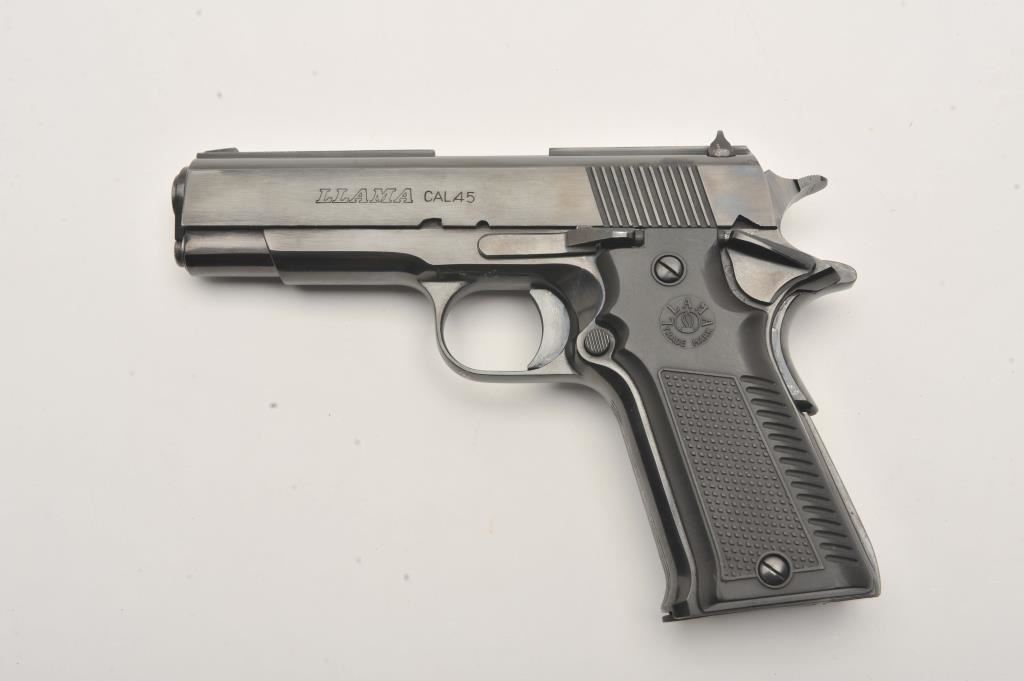 Llama Standard Model IX-B semi-automatic pistol, .45 caliber, Serial #B57617. The pistol is in excellent overall condition with a 4 ¼” barrel. The pistol retains nearly all of its blue finish with only light handling marks noted. The left side of the frame has several proofs while the right side is import marked. The checkered plastic grips are in very good condition with sharp checkering. The bore is very good, the action is crisp and the markings are sharp. The lot includes one correct magazine and the factory plastic case with matching label. Est.: $300-$600. (Modern/PPT).