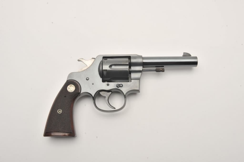 Colt New Service Double Action revolver in .44-40 caliber with 4 ½” barrel, S/N 336452 and made 1933. “Piece parts” variation displayed at Buffalo Bill museum in Colt Collector’s displays and pictured in “Colt and Their Collectors”. This revolver shows 97%-99% original blue finish with minor evidence of firing and use. Slight losses to muzzle and edges but crisp overall with near excellent checkered wood medallion grips. Pristine interior with bright bore and tight action. Bright original polish on sides of hammer. Refer: Page 45 of New Service Revolvers by Bob Murphy (A.K.A. Gil Newton where 1932 “Piece parts” guns are discussed. Colt basically cut costs and used up parts during the depression. 44-40 is scarce in this era. (C&R/PPT) Est.: $2000-$4000