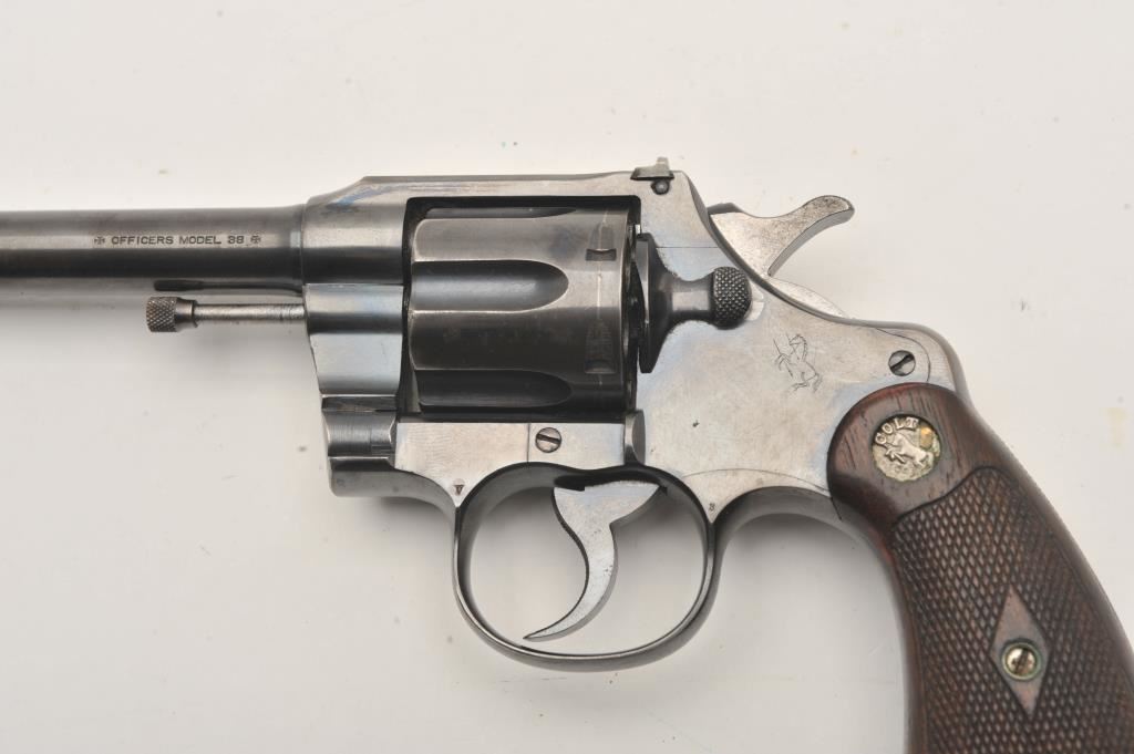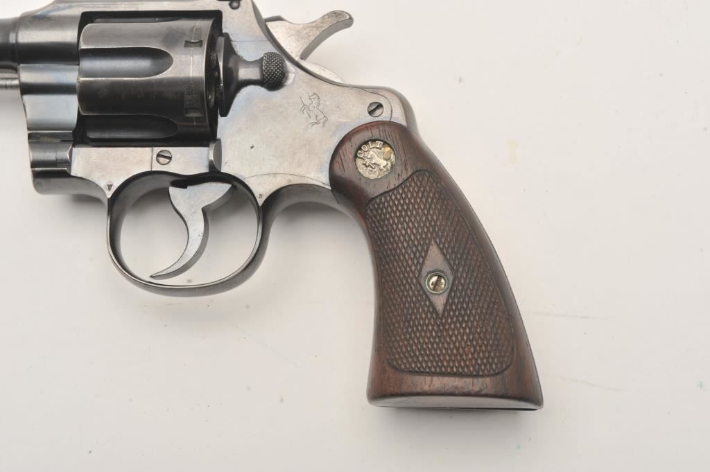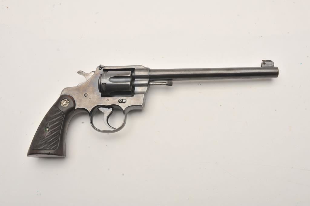 Colt Officer's Model Target #451007, .38 Special cal., 7 1/2" barrel, blued finish, with checkered medallion grips. Revolver is in very good condition overall, good bore, good action, grips are good with no chips or cracks. Revolver retains the majority of it's original blue, which is thinning. Circa 1920's. (C&R / PPT) Est. $500-1000