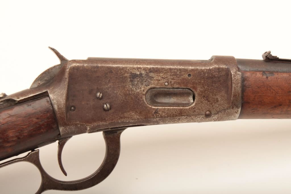 Winchester 1894 S.R.C. in .25-.35 caliber, S/N 407124. Fair to good as found condition with 20%-40% original blue, some minor rust and light pitting. Good markings. Wood is fair only with badly cracked fore end, dings, mars, dents and large losses from honest wear and use. 3 leaf special order Winchester rear sight with bead front in original post. Working with dark bore that would clean to fair or good. Has character and “Western” look. Turn of the century made. (C&R) Est.: $400-$800