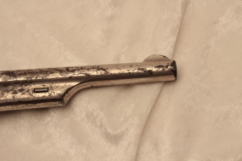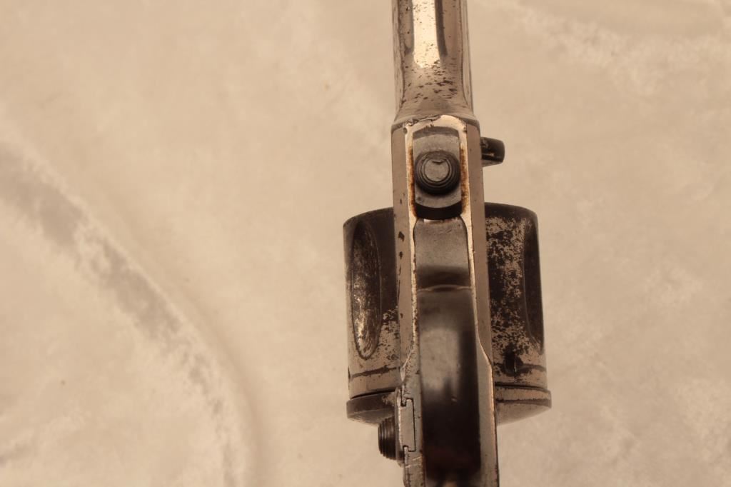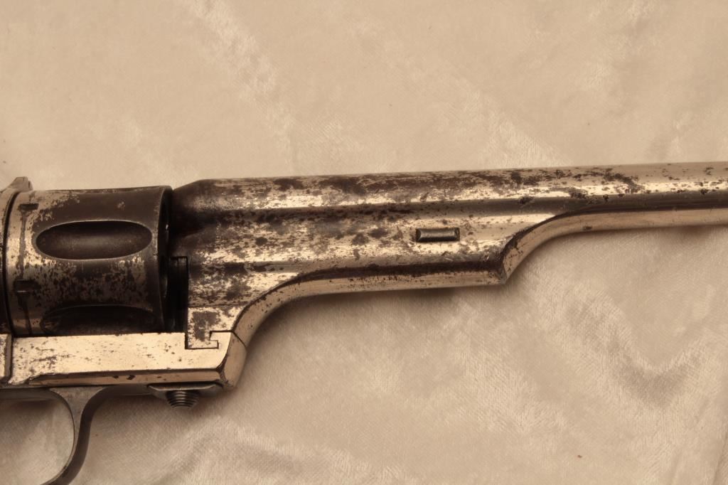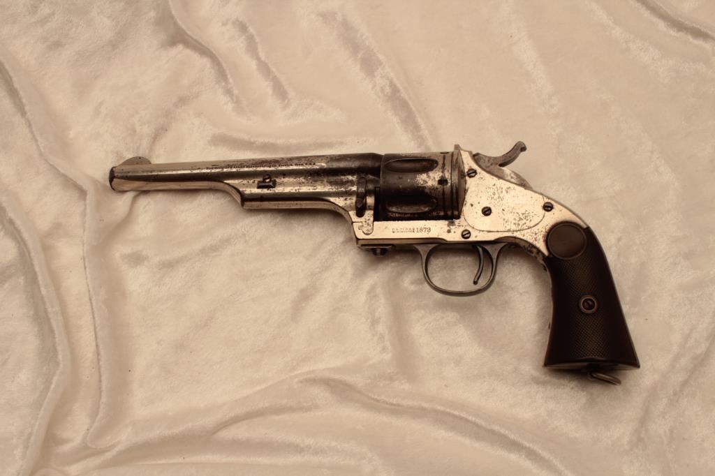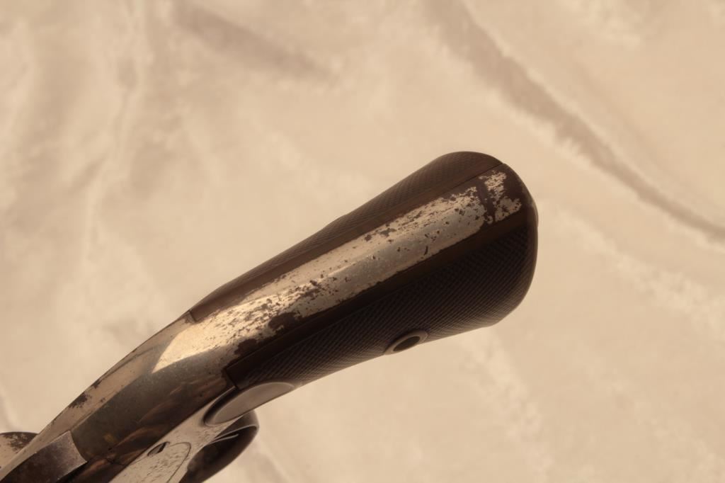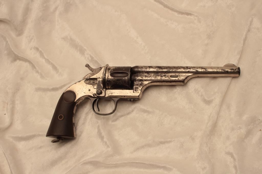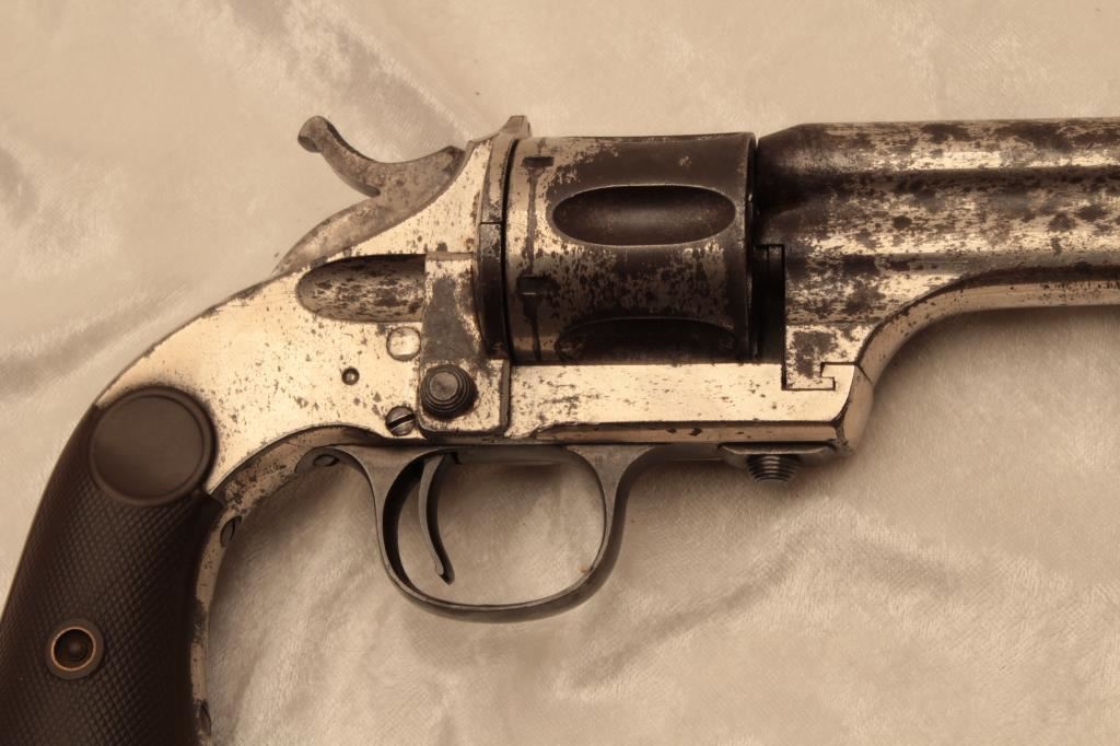 Merwin & Hulbert single action open top scooped flute cylinder revolver, .44-40 caliber, 7” barrel, nickel finish, checkered hard rubber grips, lanyard ring, S/N 11824; considerable original nickel finish remaining, crisp action, good markings, fair bore and good grips. (Antique). Est.: $1,250-$2,500.