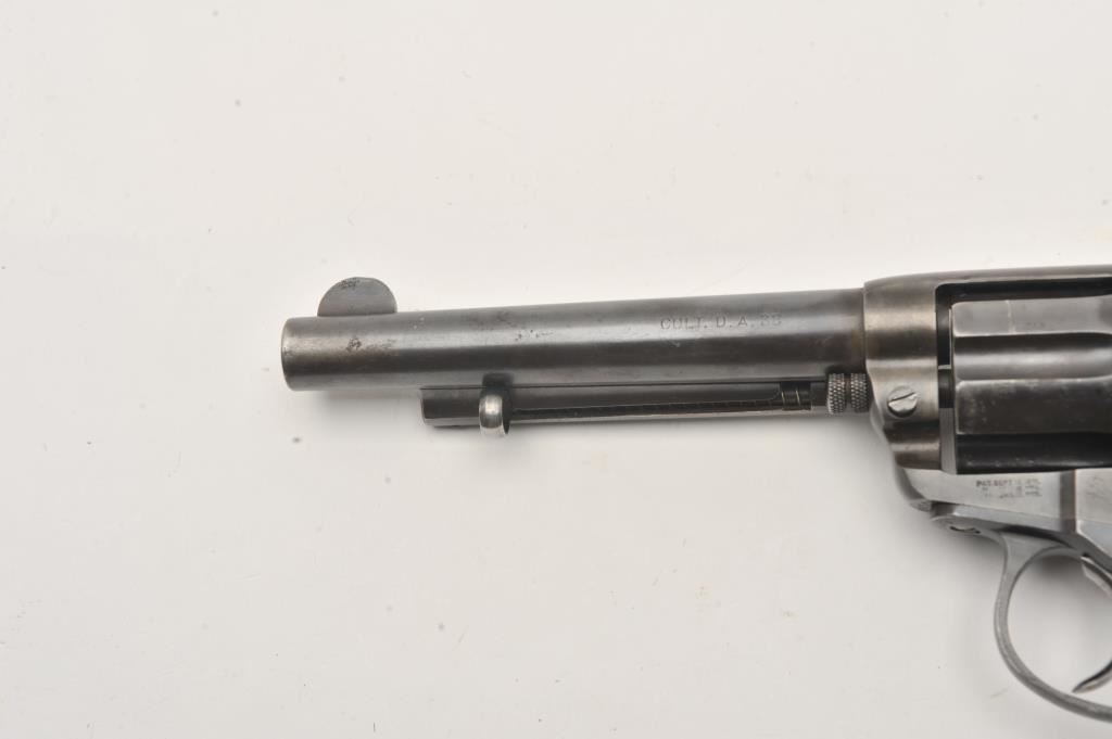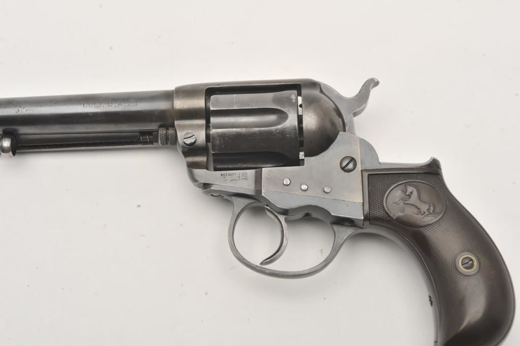 Colt Model 1877 Lightning revolver with a 5” barrel, S/N 95552 (Pre-98). Good to very good condition with traces of finish mixed in brown patina. Good marks. Carry wear to good grips. Action working and bore bright. Matching. (Antique) Est.: $500-$1000