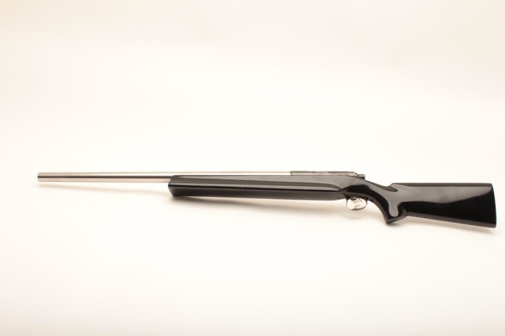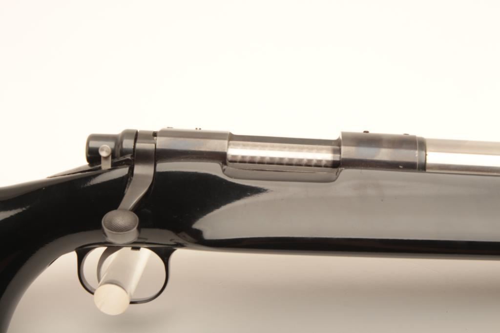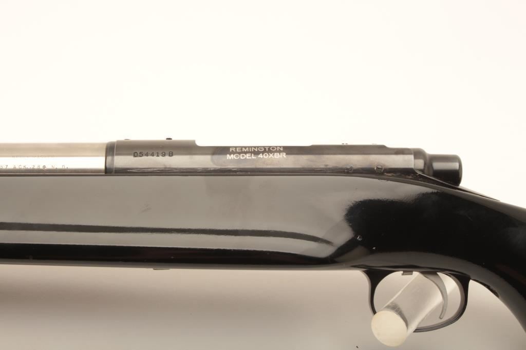 Remington Model 40XBR single shot bolt action target rifle, .257 Ackley Improved caliber, Serial #054419B. The rifle is in fine overall condition with a 26” stainless steel bull barrel marked, “SEELEY MASKER”. The barrel retains nearly all of its stainless steel finish while the blued receiver shows small scratches and edge wear. The receiver has been drilled and tapped to accommodate scope mounting. The smooth wood target stock is finished ion black lacquer with a flat fore end and no butt plate. The bore is very good, the action is crisp and markings are sharp. The lot includes a set of RCBS reloading dies, scope mounts and rings. Est.: $1,400-$2,800. (Modern).