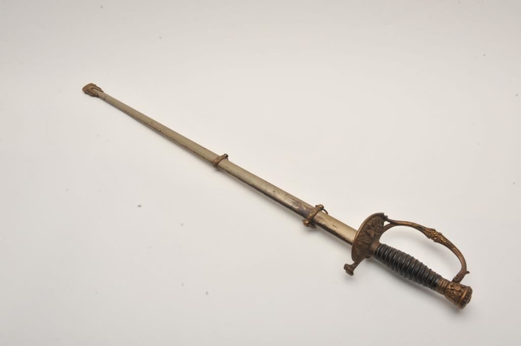 Model 1860 Staff and Field Officer’s sword and metal scabbard by B.M. Whitlock/New York, wire wrapped grip, brass guard, nickel finish scabbard; overall good condition. Est.: $150-$300.