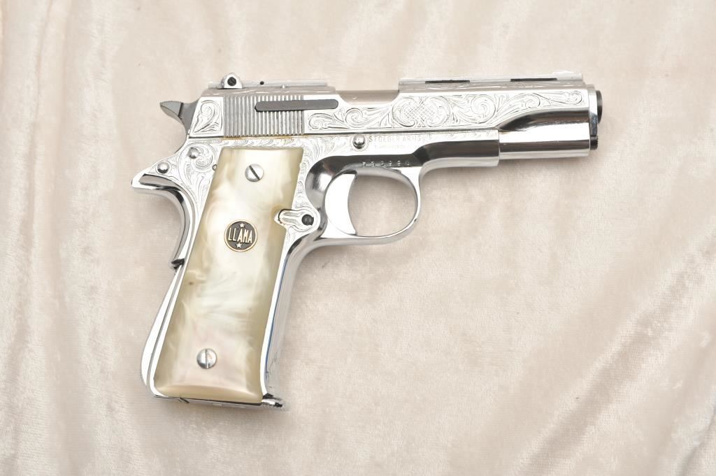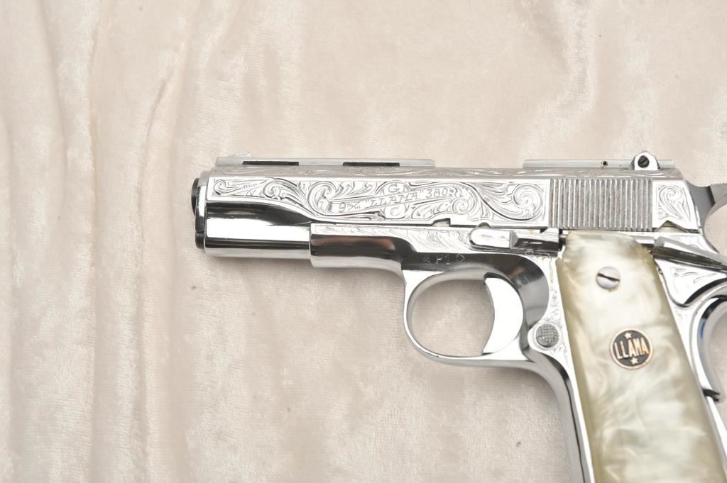 Llama IIIA #538996, 3 3/4" barrel, factory engraved and chrome plated, vent rib slide with faux pearl medallion grips. Pistol is in fine condition, very good bore, good action, grips are good with an old repair in the left grip panel. Manufactured in 1971. Includes faux alligator fitted case, original box and one correct magazine. (Modern / PPT). Est. $400-800