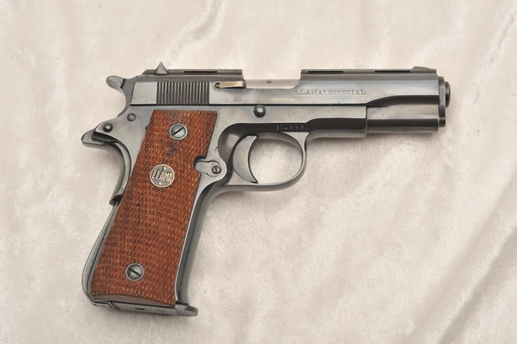 Llama Especial #314895, .22 LR, 3 3/4" barrel, blued, vent rib slide with checkered medallion grips. Pistol is in very good plus condition, very good bore, good action, grips are good with minor chip on the toe of the left grip panel. Manufactured in 1961. Includes one correct magazine. (C&R / PPT) Est. $300-600
