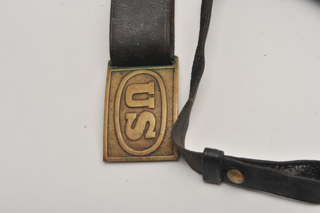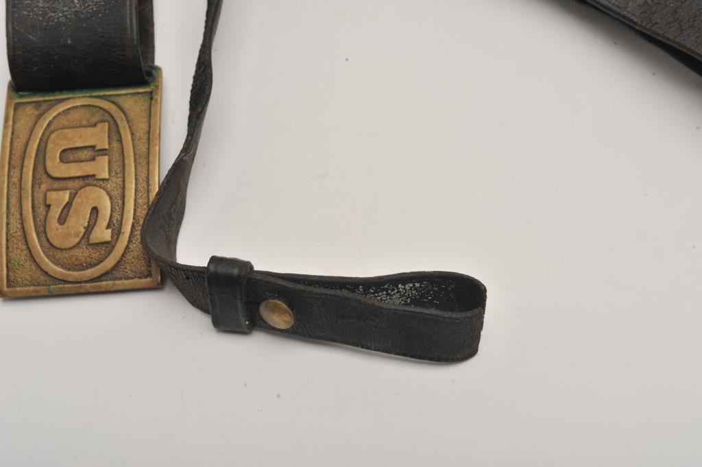 Leather U.S. Cavalry rig for Colt/Schofield single action revolvers (two position clasp in flap of holster (flap stamped “40” and rear of belt hanger shows old carved initials “J B S), belt and brass buckle, cartridge pouch (marked R. White) and sword hanger. Est.: $700-$1,400.