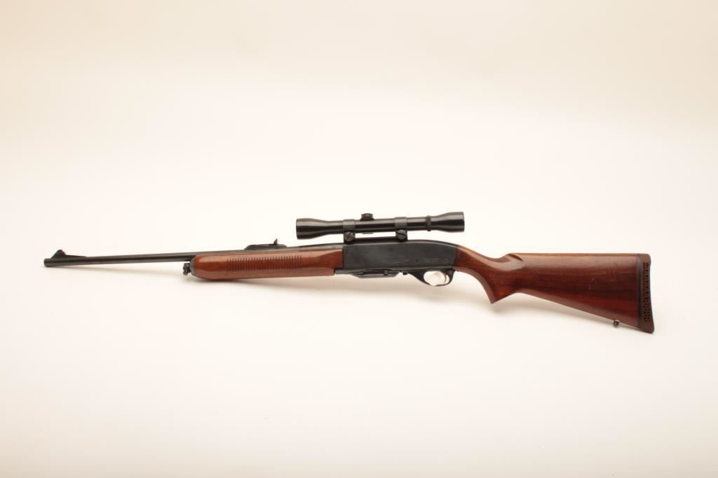 Remington Woodmaster Model 742 semi-automatic rifle, .30-06 SPRG. caliber, 22.5” barrel, blued finish, wood stocks, S/N 81373; mounted with a Weaver K-4/60-C scope displaying clear optics; overall very good + condition with majority of blued finish remaining, very good bore, crisp action, sharp markings and overall very good wood with some old scratching around front of butt stock from carry and handling. (Modern). Est.: $300-$600.