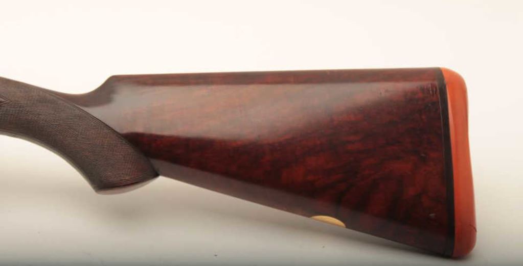 August Francotte single barrel trap shotgun, 12 gauge, Serial #80879. The shotgun is in fine overall condition with a 34” barrel with a hand filed full-length ventilated rib and ivory bead front sight. The barrel is marked, “VON LENGERKE & DETMOLD, retaining the majority of its blue finish with wear at the muzzle and small scratches. The receiver shows old, toning case hardening with light engraving around the screw heads. The finely checkered wood stocks are in very good condition with a beaver tail fore end showing mars and compressions consistent with field use. The butt stock has a gold tone escutcheon plate marked, “CC” and ends with a hard rubber Silvers style pad providing a 14 ¼” LOP. The bore is good, the action crisp and markings are sharp on this fine, Belgian made pre-war trap gun. Est.: $900-$1,800. (C+R).
