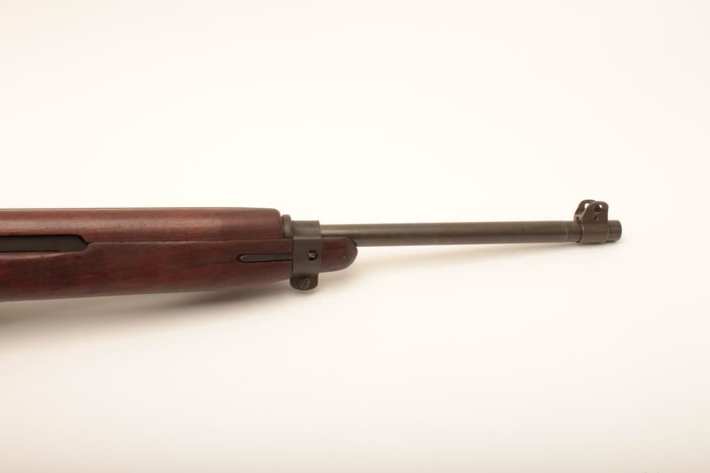 US M1 carbine by Winchester, .30 caliber, Serial #6502100. The carbine is in very good overall condition with a Winchester marked barrel. The metal surfaces retain the majority of their military finish with wear at the muzzle and handling marks. The rear aperture sight is a later example and the trigger housing is by Inland. The smooth wood stock is in very good condition with sharp cartouches of crossed cannons on the right side and “Y” behind the trigger guard. The canvas sling and oiler are retained and the butt ends with a textured steel butt plate. The bore is good, the action is crisp and the markings are sharp on this WWII era Winchester carbine. The lot does not include a magazine. Est.: $700-$1,400. (C+R).