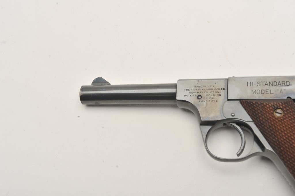 Hi-Standard Model "A", #81927, .22 LR cal., 4 1/2" barrel, blued finish, adjustable sights, with checkered grips. Pistol is in fine condition overall, showing 98% original finish, thinning slightly at the muzzle. The grips are fine with no chips or cracks, very minor chip on the lower left panel. The bore and action are very good. Includes one correct mag. (C&R / PPT) Est. $600-1200