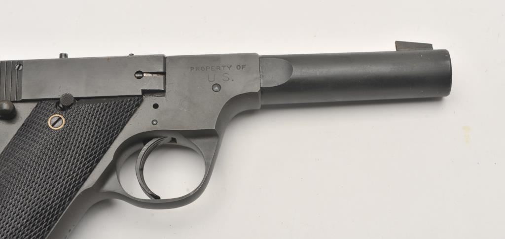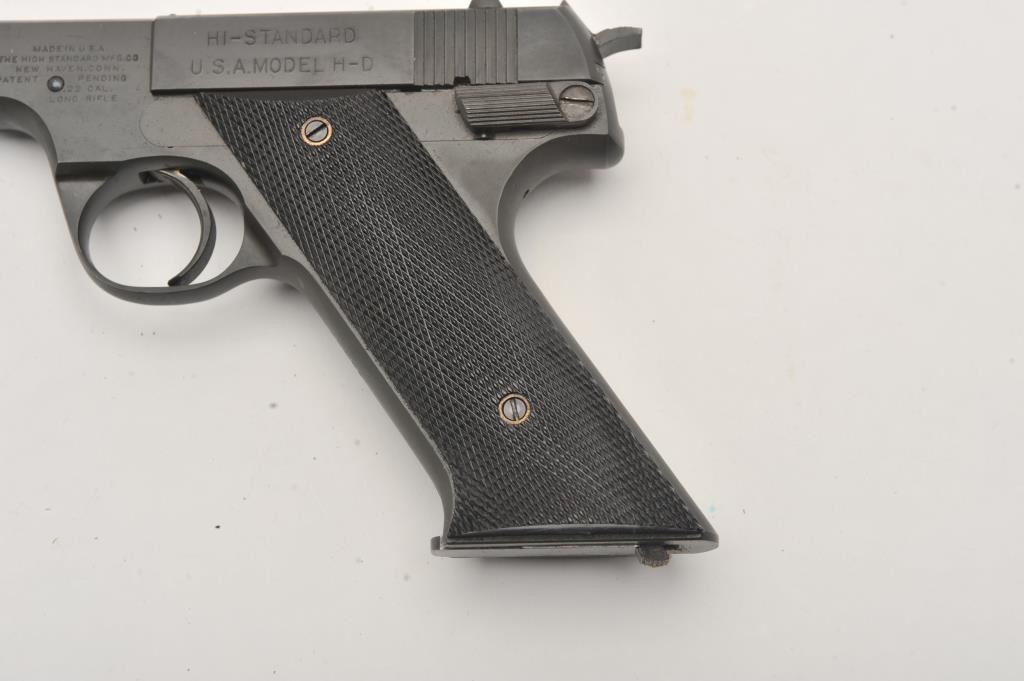 Hi-Standard USA Model H-D, #129270, .22 LR cal., 4 1/2" heavy barrel, parkerized finish, fixed sights, with checkered grips. US Property marked, with crossed cannon proofs. Pistol is in fine plus condition overall, showing 98%+ original military finish. The grips are very good plus with no chips or cracks. The bore and action are very good. Includes original box in fair condition, with instructions, and one correct mag. (C&R / PPT) Est. $600-1200