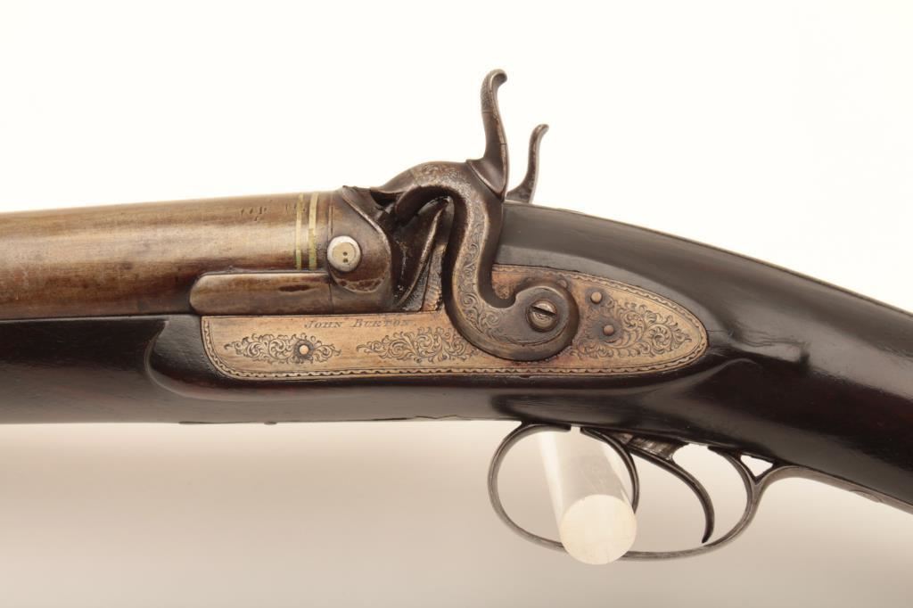 English SxS percussion shotgun by John Burton, London, 10 gauge, 32” barrels, engraved side plates, hammers and trigger guard, wood stocks, overall good condition with good action, good markings and overall good wood stocks. (Antique). Est.: $400-$800.