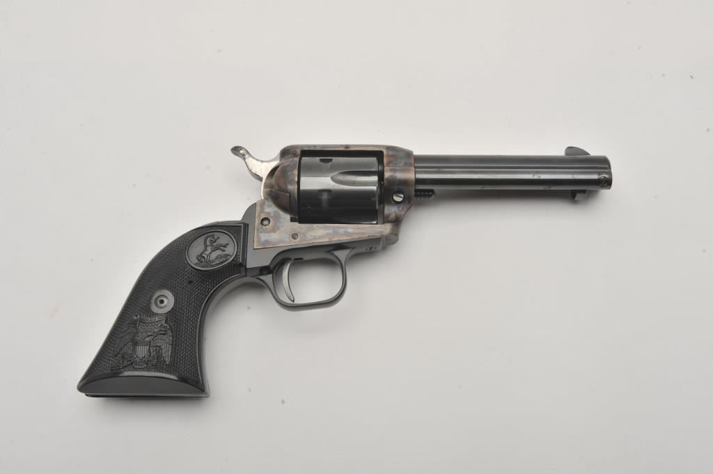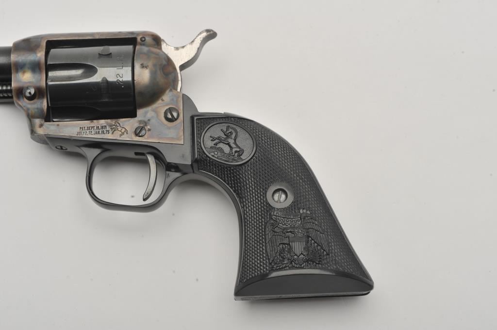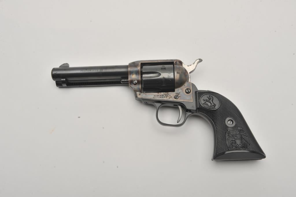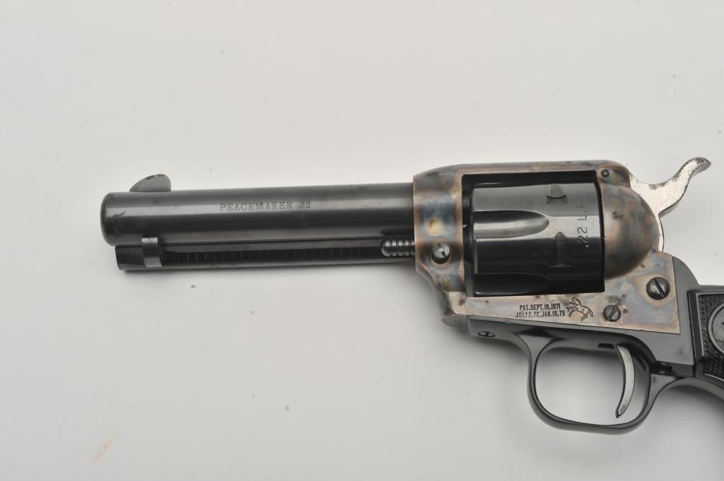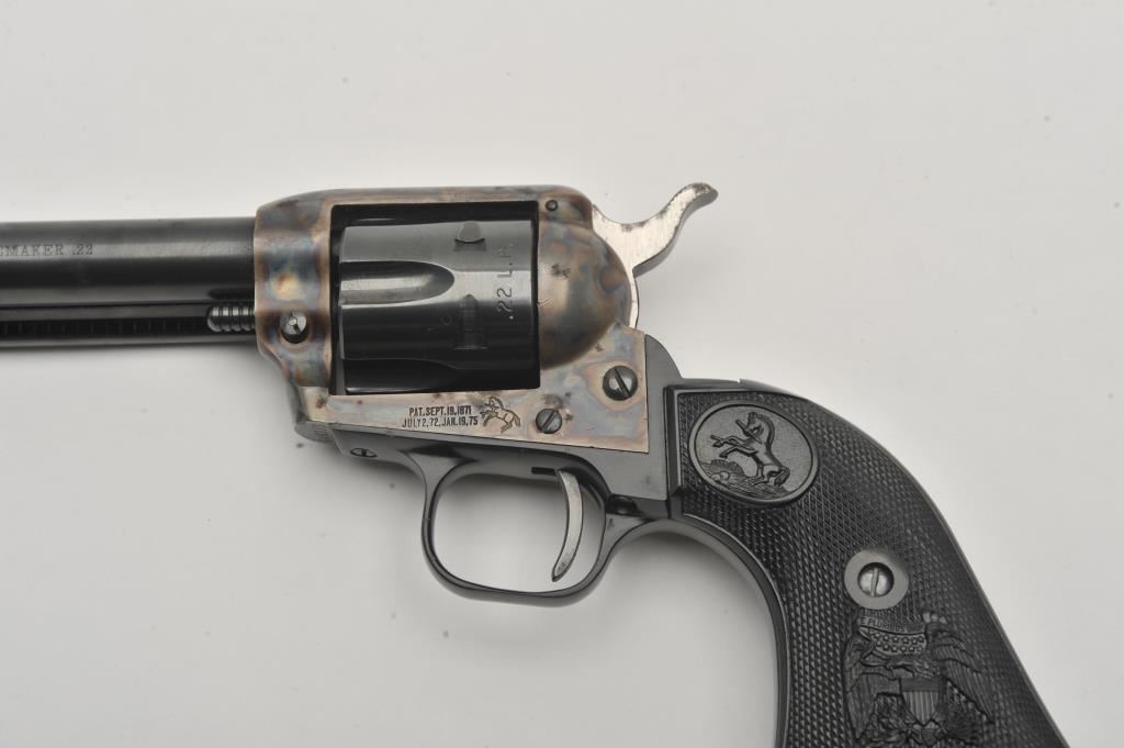 Colt Peacemaker .22 Single Action revolver, .22LR caliber, 4.25” barrel, blued and case hardened finish, checkered eagle hard rubber grips, S/N G46979; overall very good to near fine condition showing majority of original blue and case colors with some scattered spots of erosion from storage; crisp action, very good bore, sharp markings and near fine grips. (Modern/PPT). Est.: $400-$800.