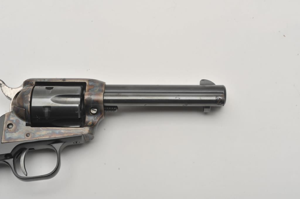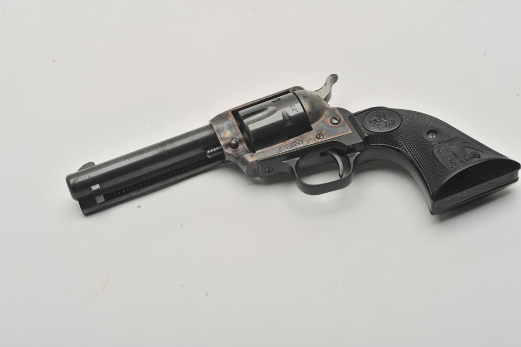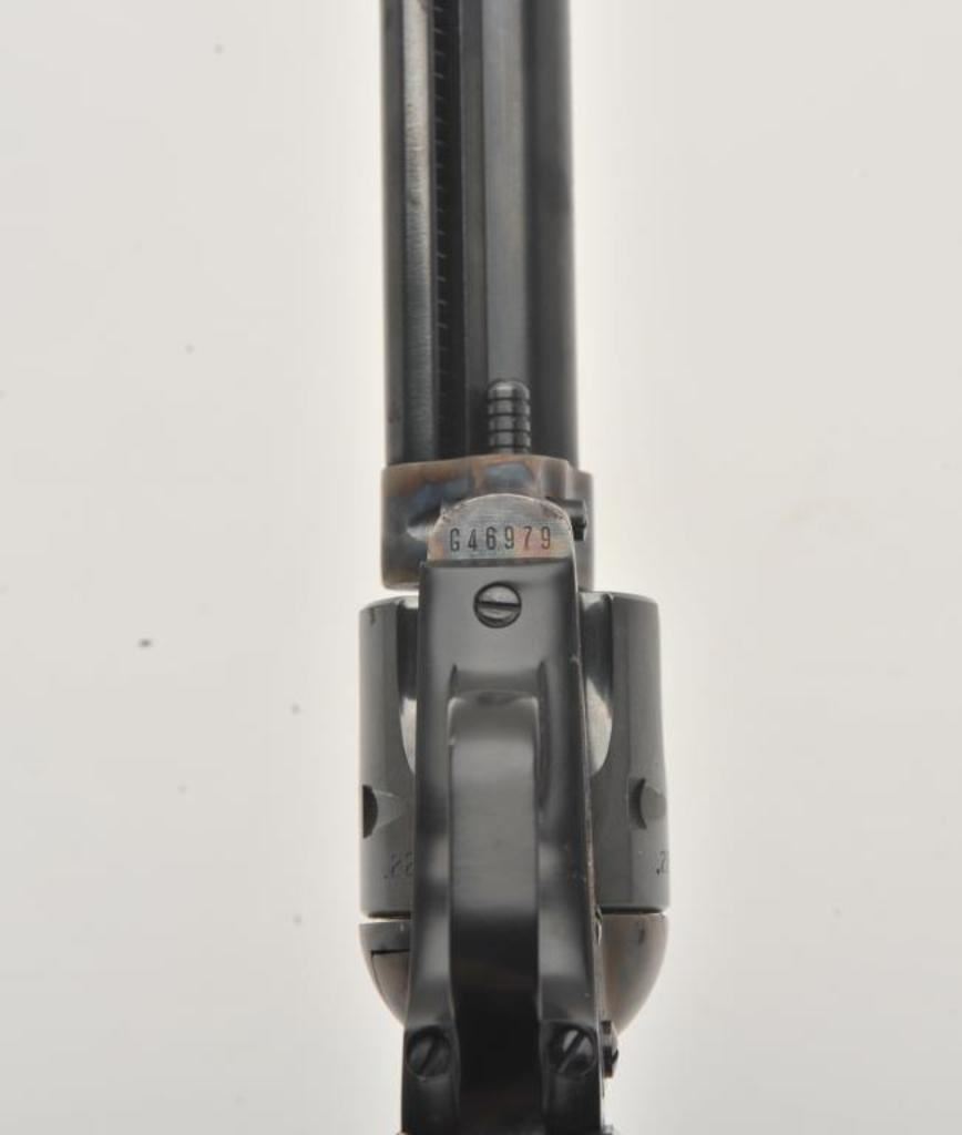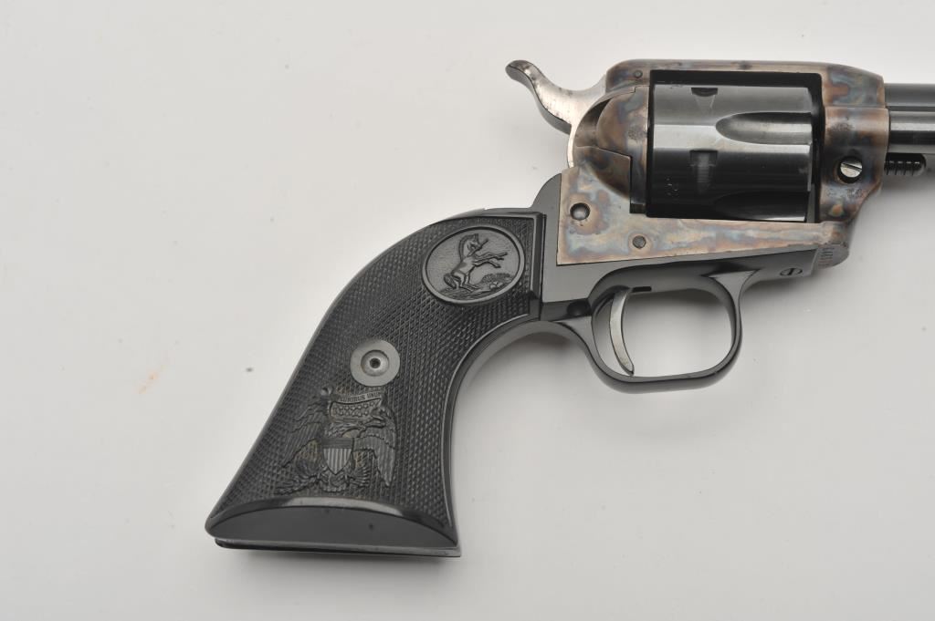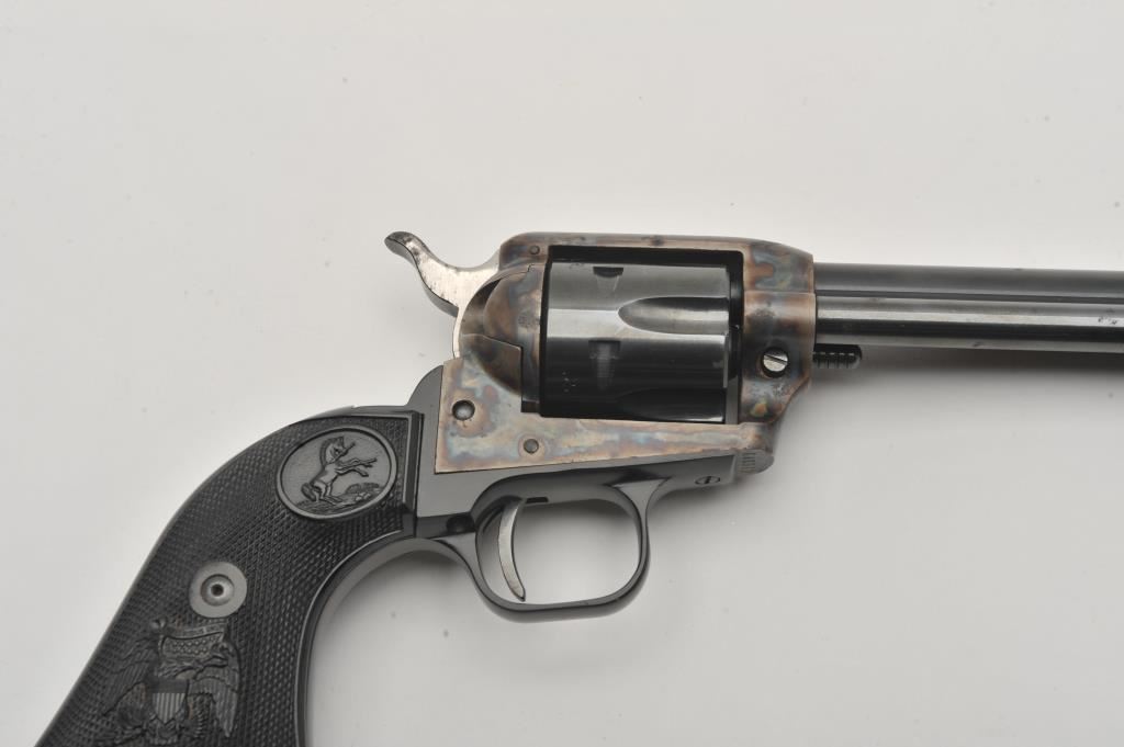 Colt Peacemaker .22 Single Action revolver, .22LR caliber, 4.25” barrel, blued and case hardened finish, checkered eagle hard rubber grips, S/N G46979; overall very good to near fine condition showing majority of original blue and case colors with some scattered spots of erosion from storage; crisp action, very good bore, sharp markings and near fine grips. (Modern/PPT). Est.: $400-$800.