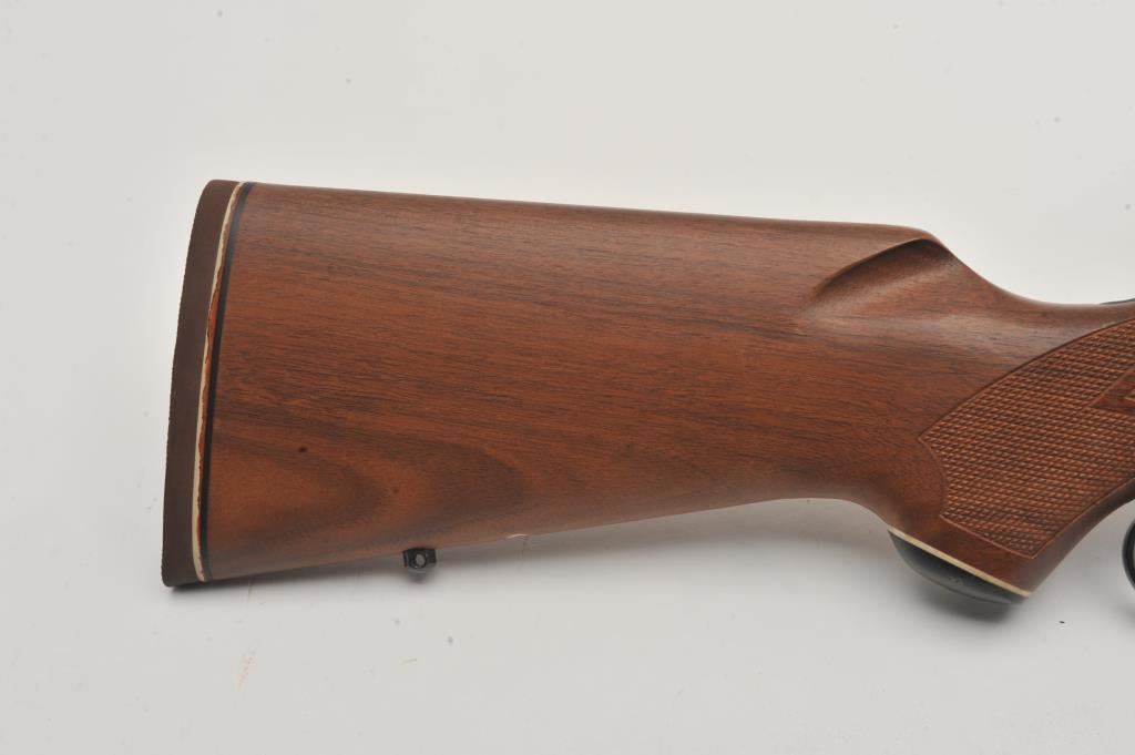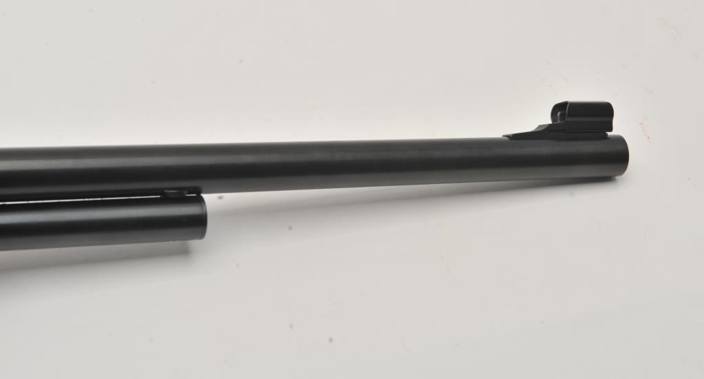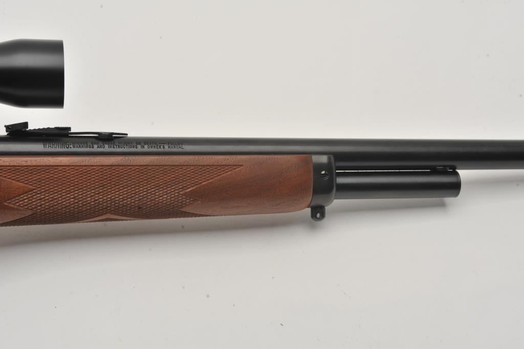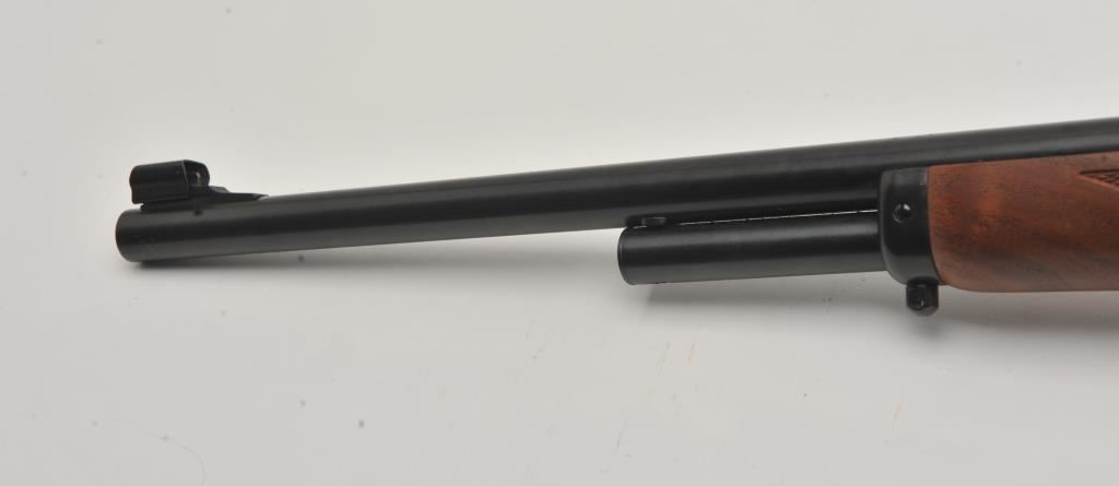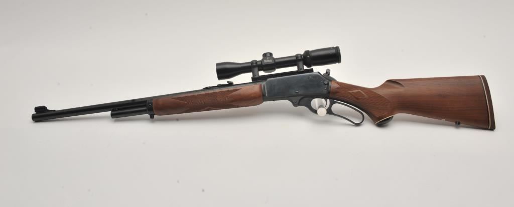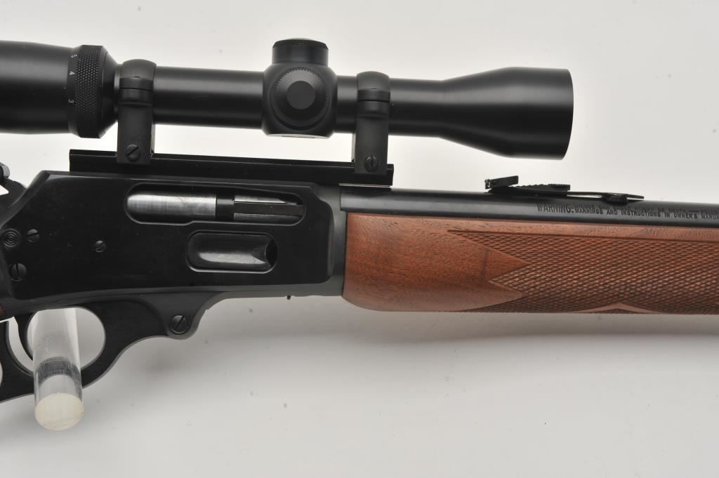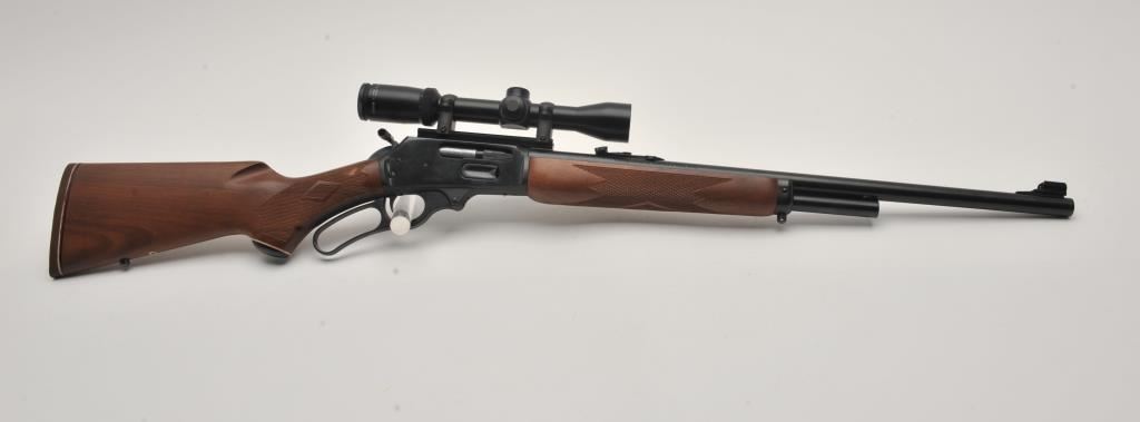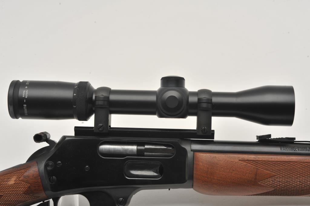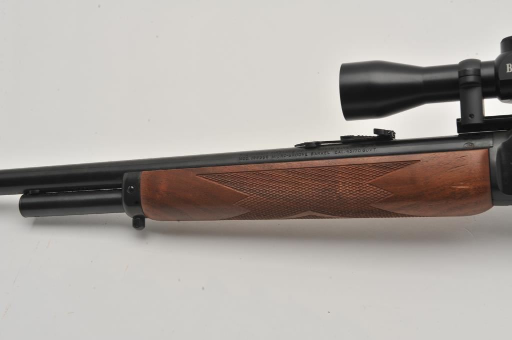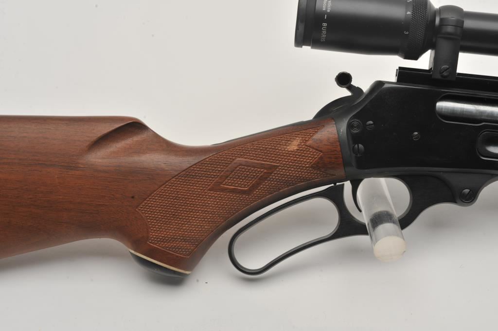 Marlin Model 1895 SS lever action rifle, .45/70 Govt. caliber, Serial #06040520. The rifle is in fine overall condition with a 22” barrel with a hooded post front and folding rear sights. The metal surfaces retain nearly all of their blue finish with only light handling marks. The receiver is topped with a Burris Fullfield 2 x 7 variable power scope with clear, crisp optics. The checkered wood stocks are in good condition with mars, dents and some flattening of the checkering. The butt stock ends with a Marlin marked rubber butt pad. The bore is good, the action crisp and markings are sharp on this Marlin chambered in the stout .45/70 Government cartridge. Est.: $350-$700. (Modern).