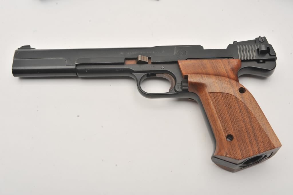 Smith & Wesson Model 78G .22 caliber CO2 air pistol, Serial #0026648. The pistol is in very good overall condition with an 8” barrel. The metal surfaces retain the majority of their black finish with wear at the muzzle. The checkered wood target grips are in very good condition with sharp checkering. The lot includes the original factory cardboard box with a blue, S&W marked box of CO2 cartridges, oil packet and CO2 assembly. Est.: $125-$250.