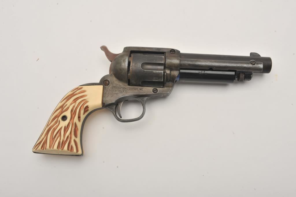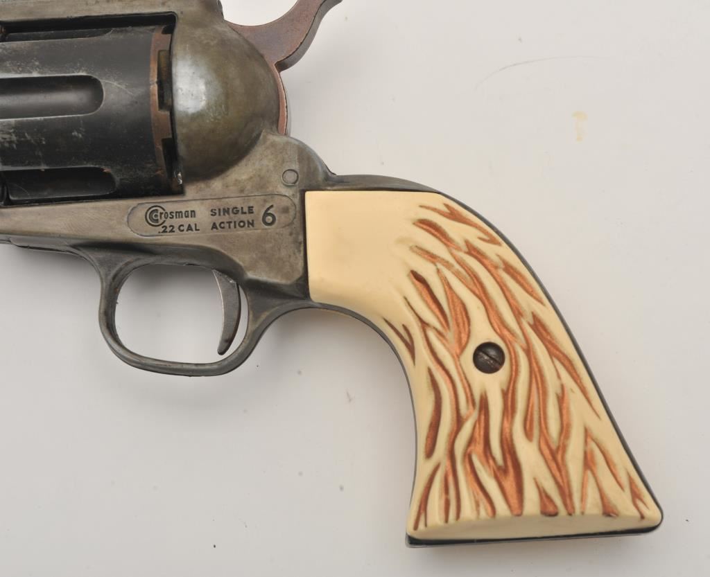 Lot of two .22 caliber Crosman CO2 air pistols and leather holsters. The lot includes Crosman Model 380 and Single Action 6 air pistols. Both pistols are in good overall condition and include a snap leather belt holster and open-top leather belt holster. Est.: $100-$200.