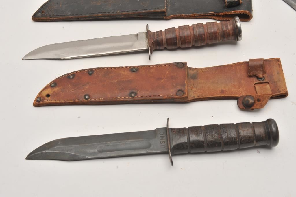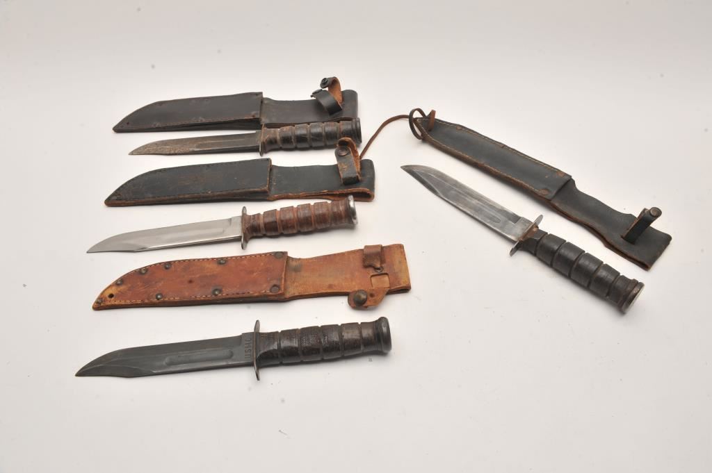 Lot of 4 U.S. military knives as described: 1. Kabar with scabbard. U.S.M.C. WWII. Good condition 2. Camillus MK 2. Kabar style with scabbard. Very good. 3. Japan marked copy of MK 2 with scabbard. Vietnam era. Privately purchased style. Sharpened. Very good. 4. Camillus Kabar MK 2 style with plated blade. Tag notes scabbard with marked in thread “Robert Shgata”. Knife is very good plus. The scabbard is good. Thread has mostly deteorated and “Shadow visible”. Est.: $175-$350