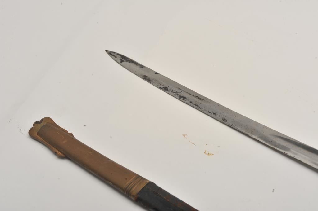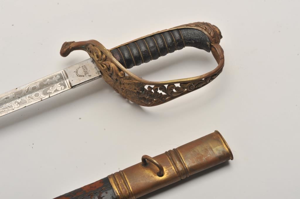Austrian Officer’s sword ca. 19th to early 20th Century marked “Weyersburg + Stamm – Solingen” with nicely etched blade showing two headed eagle; also repeated in design on guard; good overall other than heavy pitting on last 12” of blade near tip; scabbard shows minor tatters and small losses; sword does not fully fit into scabbard at time of description; careful cleaning of last 12” of blade may help that situation. Est.: $250-$500.