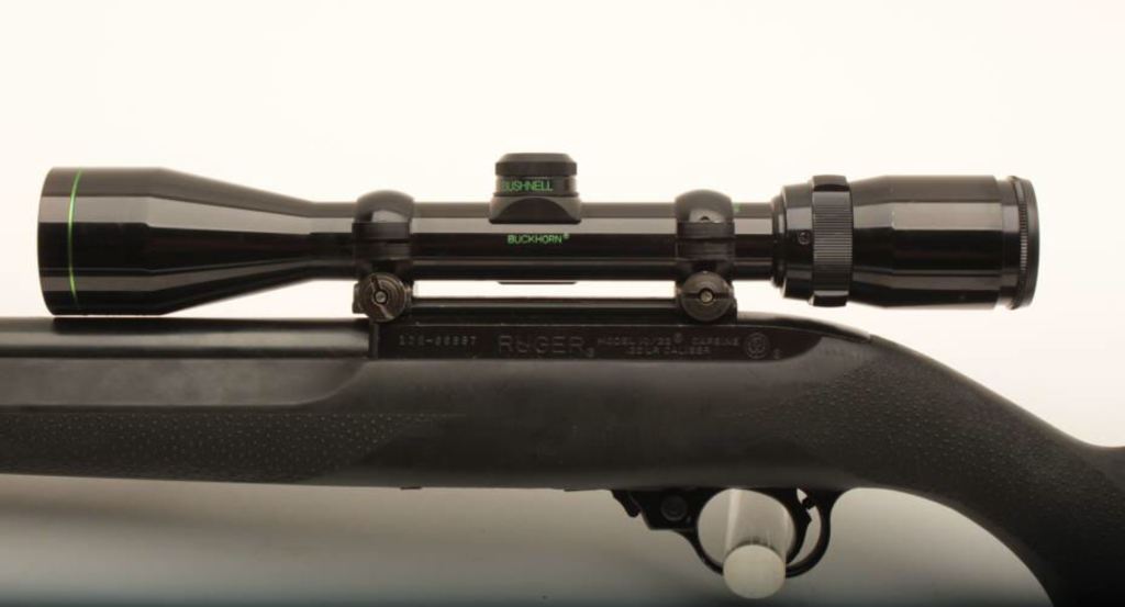 Ruger Model 10-22 semi-automatic carbine, .22 Long Rifle caliber, Serial #126-66897. The carbine is in very good overall condition with an 18” Shilen marked bull barrel. The barrel retains a significant amount of its blue finish with a small area of light surface rust on top of the barrel. The receiver retains the majority of its black finish with small scratches on the trigger guard. The Hogue textured rubber stock is in very good condition with small marks from carry and use. The carbine is topped with a Bushnell Buckhorn 3 x 9 variable power scope. The bore is good, the action crisp and markings are sharp on this customized Ruger with a desirable Shilen barrel. The lot includes a nylon rifle sling and rings. Est.: $300-$600. (Modern).